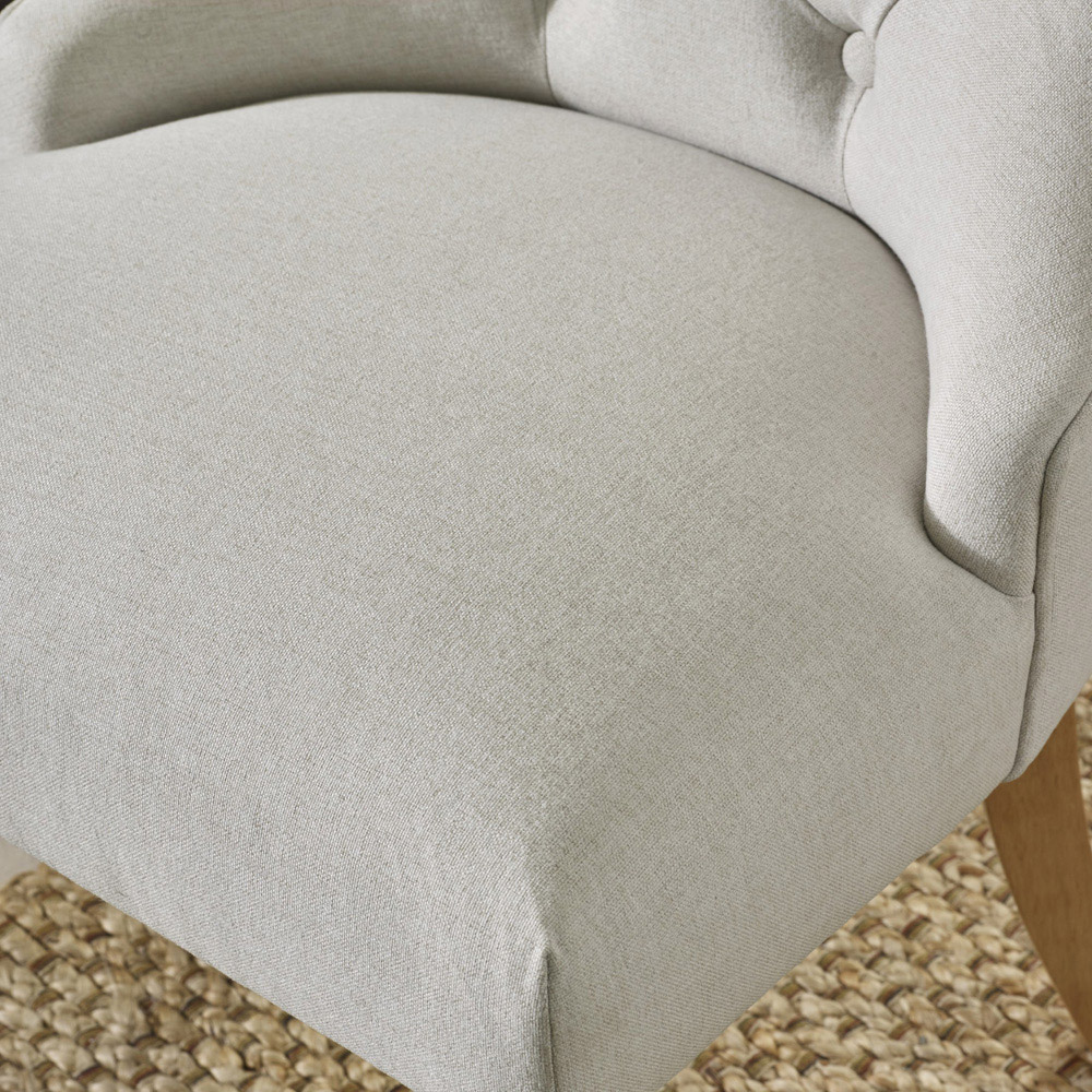 This Fowey round wooden extending dining table with pedestal leg in light grey and limewash effect is all about that chic rustic farmhouse style. This table will comfortably seat 4 when closed and 6 when extended. Clean lines, sturdy design, rounded edges to the table top and sitting on four feet jutting from that central pedestal leg, this table will look fab in any modern home, whether you're going for sleek minimalism, that French elegant cottage look or even as part of an eclectic maximalist space. Constructed from solid 100% rubberwood with light grey painted legs and a white-grey limewash effect to the tabletop, this extendable dinner table is sturdy, durable and will look great while doing it! The Fowey uses a simple butterfly mechanism - gently pull on either end of the table to 'open' the sliding mechanism and reveal the extension piece concealed under the top. Lift and unfold the extension piece to create the additional length. The Kennsington dining chair in stunning beige fabric and oak effect legs is the ultimate in dining chair opulence, pairing modern dining styles with traditional and bright materials for a really versatile look. Featuring a tall, scoop-back design that allows you and your guests to lean back and feel supported by the wrap-around arms. Upholstered in gorgeous beige linen-look fabric that has a slightly textured weave, with stylish fabric-covered Chesterfield-inspired button tufting and diamond stitching. Resting on oak effect legs completes the modern Regency look (perfect for that Bridgerton-inspired dining room). The thick-filled seat cushion is supportive and comfortable and upholstered in durable beige linen-look fabric. This product is real wood so it will age, which can result in colour variations.