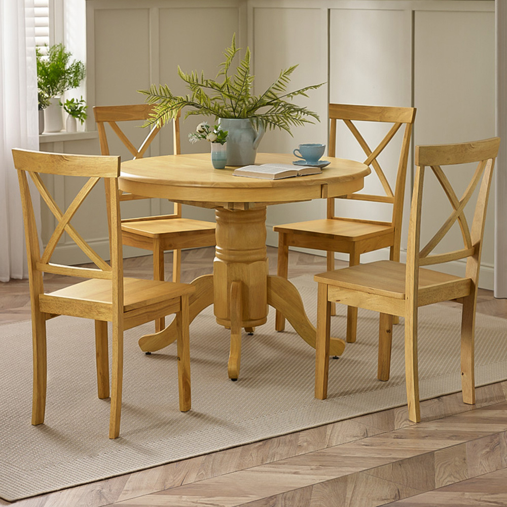This Fowey round wooden extending dining table with pedestal leg with oak effect stain is all about that chic rustic farmhouse style. This table will comfortably seat 4 when closed and 6 when extended. Clean lines, sturdy design, rounded edges to the table top and sitting on four feet jutting from that central pedestal leg, this table will look fab in any modern home, whether you're going for warm neutrals, that French elegant cottage look or even as part of an eclectic maximalist space. Constructed from solid 100% rubberwood with a warm oak-coloured stain, this extendable dinner table is sturdy, durable and will look great while doing it! The Fowey uses a simple butterfly mechanism - gently pull on either end of the table to 'open' the sliding mechanism and reveal the extension piece concealed under the top. Lift and unfold the extension piece to create the additional length. These Marros oak-effect cross-back solid wood dining chairs are a lovely take on classic traditional dining furniture styles. The cross back gives it a French cottage-style look while the oak effect stain adds warmth. Constructed from solid 100% rubberwood with oak-coloured stain, this chair is durable and will look great while doing it!