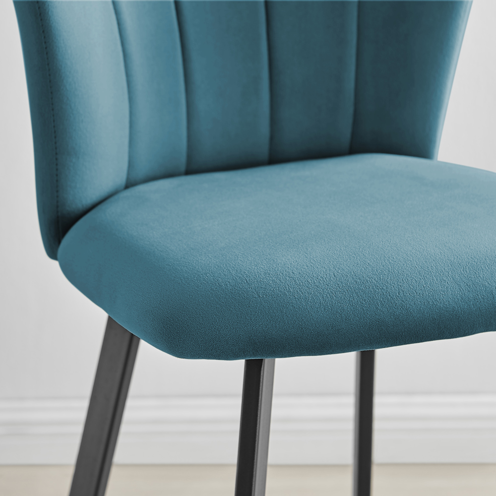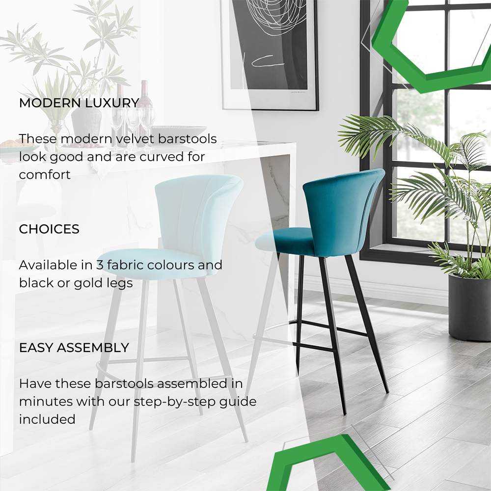 This Hazel blue velvet-upholstered bar stool set from Furniturebox is elegant and stylish. The fluted backrest and vertical stitching give it a 1920s Art Deco vibe and the tapered black metal legs with bar footrest keep it super modern. This would look great in a maximalist glam or industrial home setting, or even a sleek and chic white-and-grey home. The sumptuous soft-touch velvet with a lovely thick padded seat and an ergonomic design will make sure you're comfortable while sitting in style. Available in a range of other fabrics and leg colours!