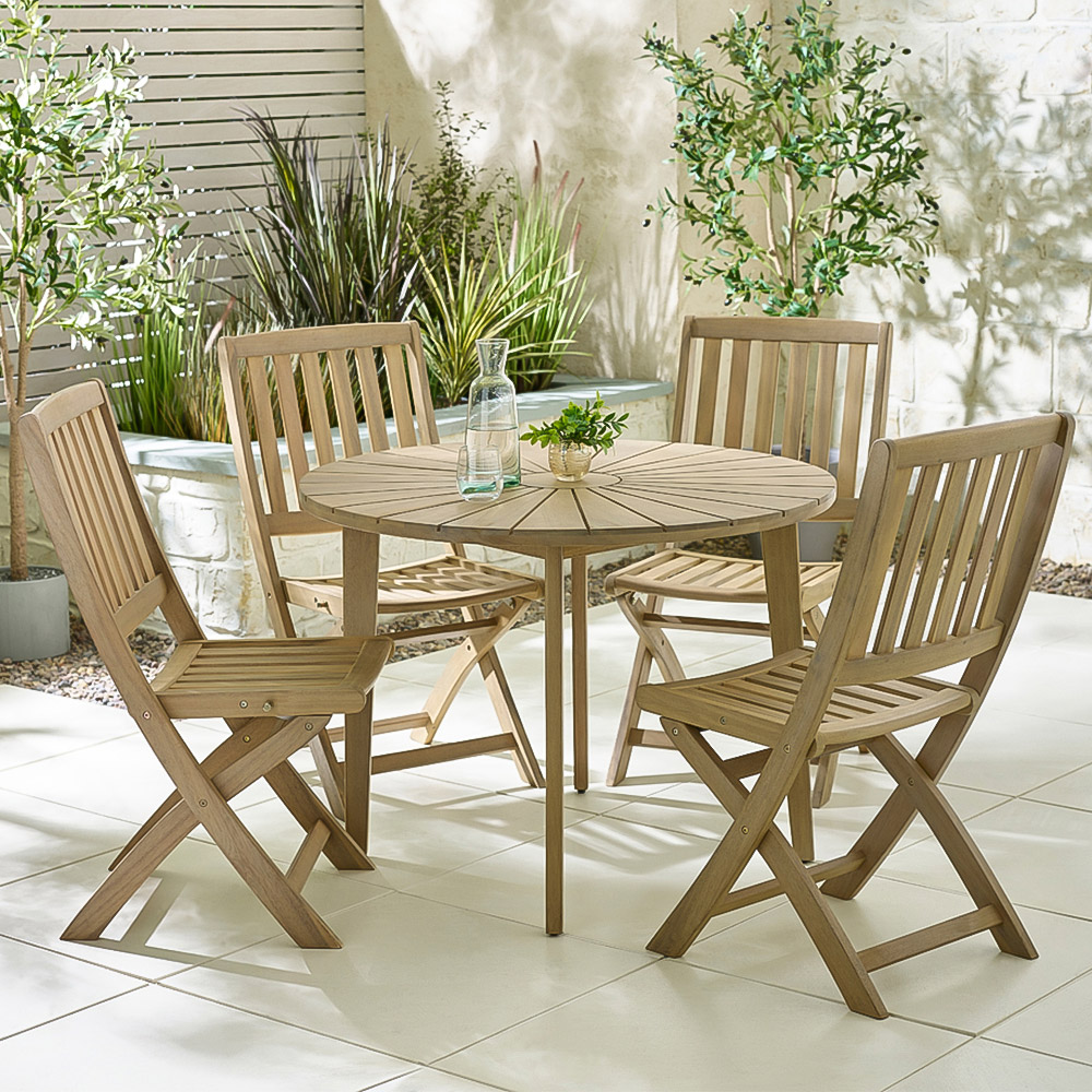 This Jarrow solid wood four-seat round outdoor dining table and four Essen wood folding chairs make for a striking all-wood outdoor dining set. The Jarrow table is sturdy and rustic, and the round tabletop features a distinctive slatted sundial pattern. The Essen armless folding chairs have chunky slatted backs and seats. All components are solid FSC-certified acacia wood with a light teak colour stain, which makes it durable and unlikely to fade. Assembly required - easy-to-follow instructions are included. Comes with a year warranty for peace of mind. Please note - Parasol is not included.