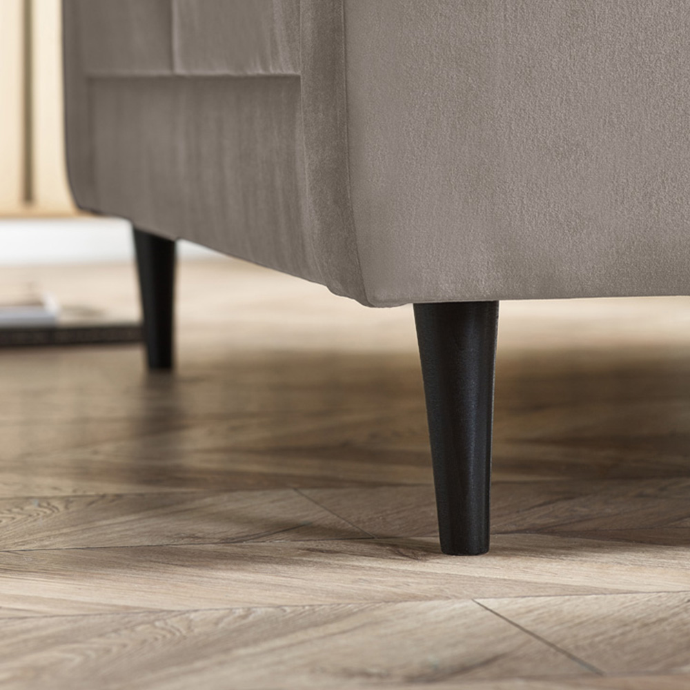 Add elegance and comfort to your space with Furniturebox Josie 2 Seater Mink Light Grey Velvet Sofa. This gorgeous soft sofa will be a perfect addition to your living room. Its modern design is complemented by sumptuous mink light grey velvet fabric, making it suitable for various styles from traditional to minimalist or maximalist. The contemporary square button tufting on the back adds a relaxed touch, reminiscent of a traditional Chesterfield sofa. it sits on black wooden tapered legs, giving it a sleek, timeless look. It sits on black wooden tapered legs, giving it a sleek, timeless look. It is constructed from a sturdy wood frame and upholstered in soft, easy-to-clean velvet, this sofa features cosy cushions and strong tapered wooden legs. It's designed to last and look great.