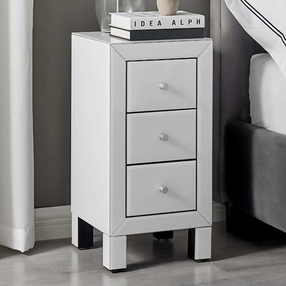 The Lacey White Small Bedside Table from Furniturebox is perfect for those with limited for space, but who don't want to compromise on storage and style. The bedside cabinet is the perfect choice for anyone looking for modern furniture within a smaller setting. This slimline drawer unit is big on style and has everything you need. Comprising of 3 drawers and a flat top to keep all your essentials tidy and organised. The mirror finish will bounce light around and keep things looking bright, perfect for smaller spaces.