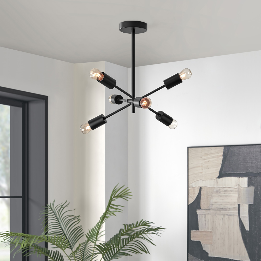 Illuminate your space with an elegant Furniturebox Laela Modern Sputnik Chandelier Black Ceiling Light. This chandelier ceiling light has a contemporary, industrial design, featuring exposed bulbs and semi-matte black metal. With its simple mid-century twist and ideal shallow drop, it will make an impact in any modern living room or dining space. This product requires 6x E27 - 8.5W LED or MAX 42W HALOGEN (not included). Please click here to find our range of lightbulbs.