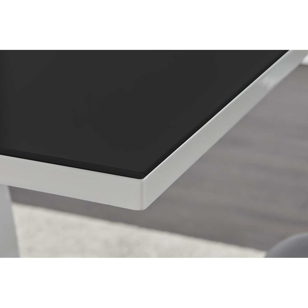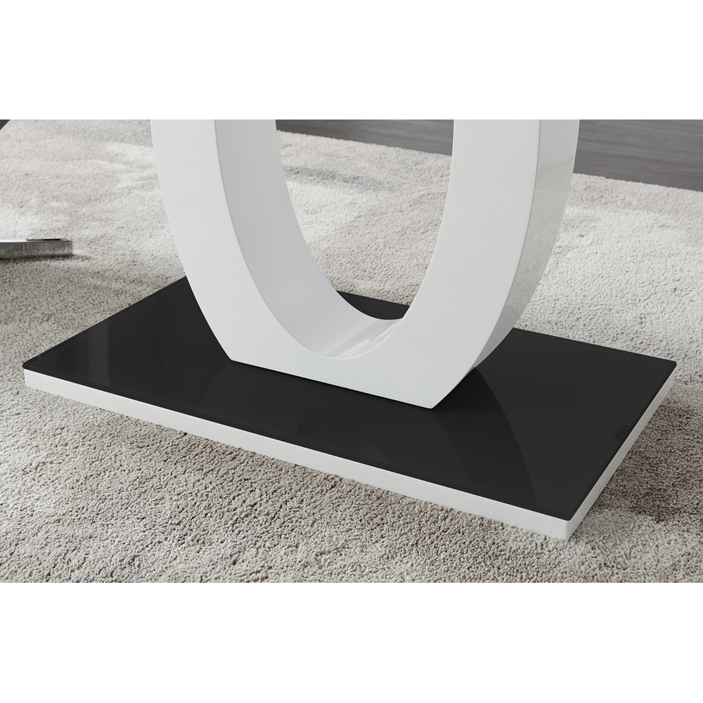 Dine in grandeur with this Furniturebox Lucia 4 Seater Black Dining Table. It features a sturdy frame with a top made from tinted black tempered glass, making it easy to maintain. The white halo support combines wonderfully with the black table top to create a chic, high-end appearance that you won't be able to take your eyes off. This artistic table can easily seat six people comfortably, with the 120 x 70cm top providing ample space for your guests to rest their drinks and food.