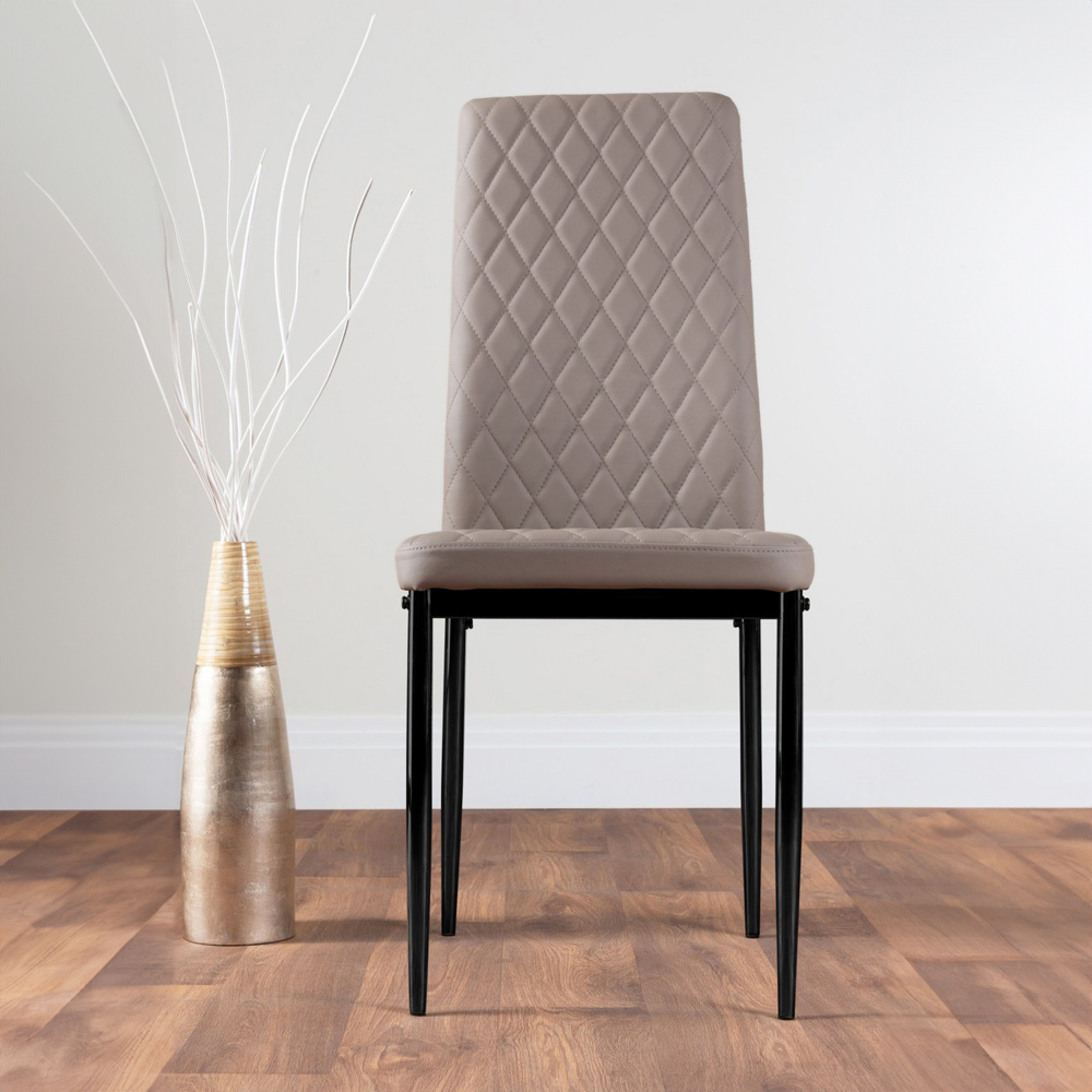 Add an elegant touch to your kitchen set with this Furniturebox Lucia Valera 6 Seater Dining Set Black Gloss and Cappuccino. This beautifully designed Lucia table features a two-tone effect and crisp, clean lines, which gives it a modern wow factor. It is silhouetted by the base and is combined beautifully to create a symmetrical centrepiece. With a 160 x 90cm tabletop, it is made from black tempered glass and is easy to maintain, which offers plenty of room for dining with guests and seats up to six people. The set includes six beautiful faux leather diamond quilted Valera chairs with sleek black powder-coated legs. These chairs are made from high-quality faux leather and are ergonomically designed for maximum comfort and support. They feature soft-touch faux leather with a deep foam seat cushion and plastic feet to protect the floor from damage.