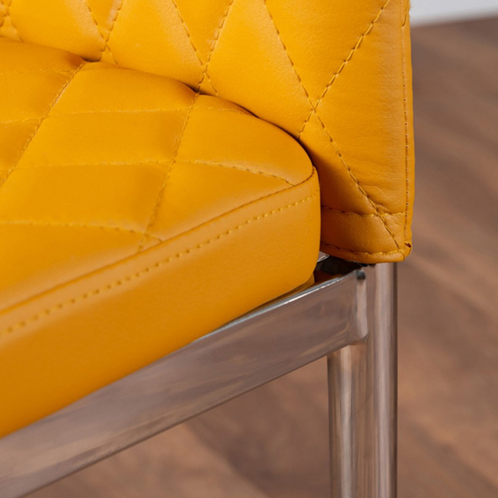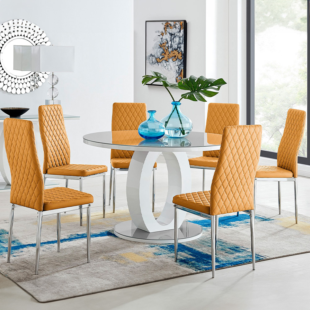 Add an elegant touch to your kitchen set with this Furniturebox Lucia Valera 6 Seater Round Dining Set Grey Gloss Mustard and Chrome. This beautifully designed Lucia table features a two-tone effect and crisp, clean lines, which gives it a modern wow factor. It is silhouetted by the circular base and is combined beautifully to create a symmetrical centrepiece. With a 120 x 120cm tabletop, it is made from grey tempered glass and is easy to maintain, which offers plenty of room for dining with guests and seats up to six people. The set also includes six beautiful faux leather diamond quilted Valera chairs. These chairs are made from high-quality faux leather and are ergonomically designed for maximum comfort and support. They feature soft-touch faux leather with a deep foam seat cushion and plastic feet to protect the floor from damage.