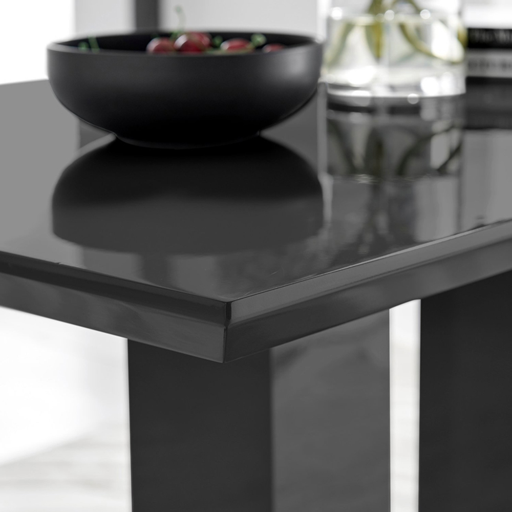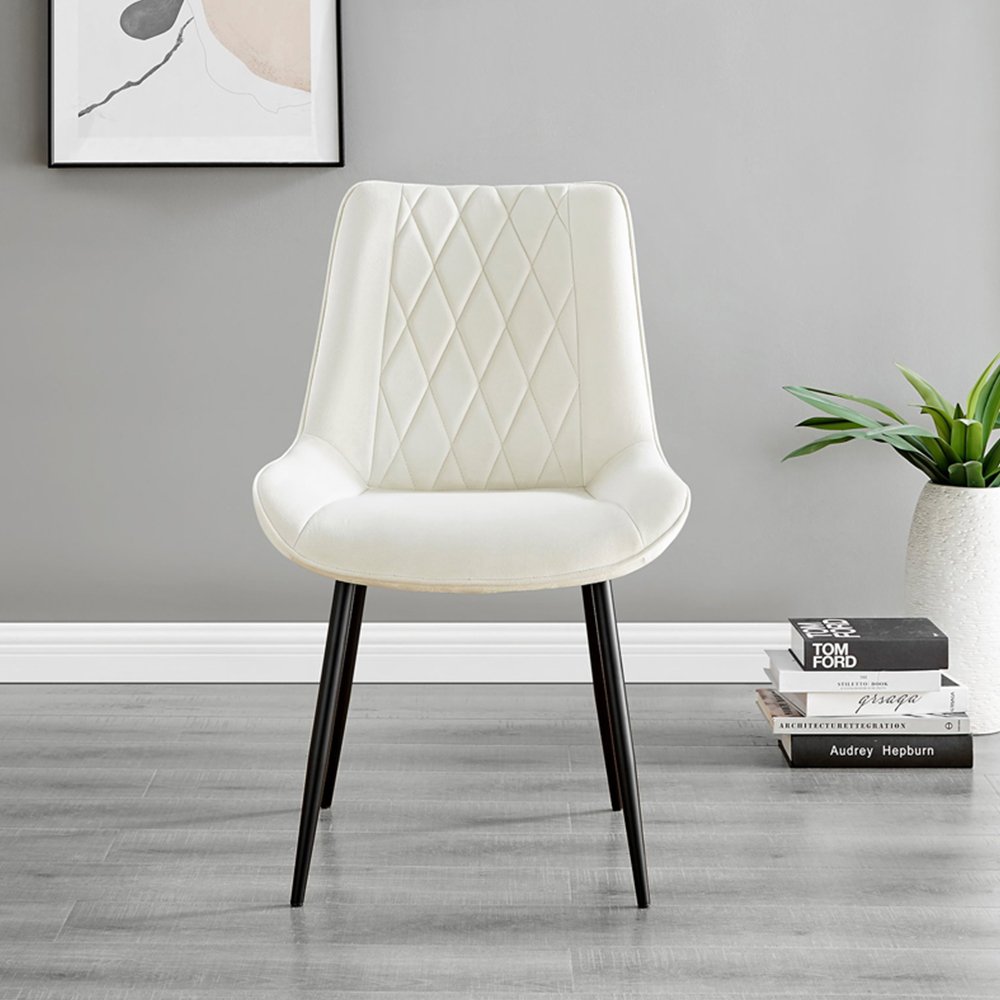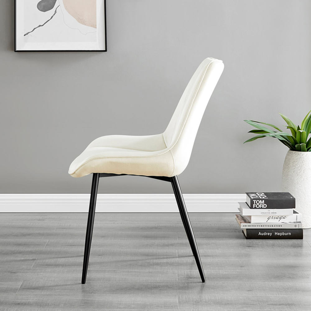 Enhance your dining experience with the Furniturebox Molini Cesano 4 Seater Dining Set Black Gloss and Cream. The dining table features a high-gloss lacquer finish with a sleek tabletop and a pillared structure with a stable base. The smooth table is suitable for most interior spaces while the open space around the base makes it ideal for relaxed dining. This set includes four cream chairs upholstered using soft velvet fabric with cosy seats for ultimate comfort. The Cesano dining chairs feature a diamond-stitched pattern with ergonomically designed curved seats and tapered black legs for stability and support. This dining set has a splendid design that will effortlessly blend with all types of interior spaces. Table size: 70 x 120cm.