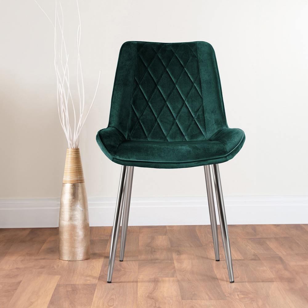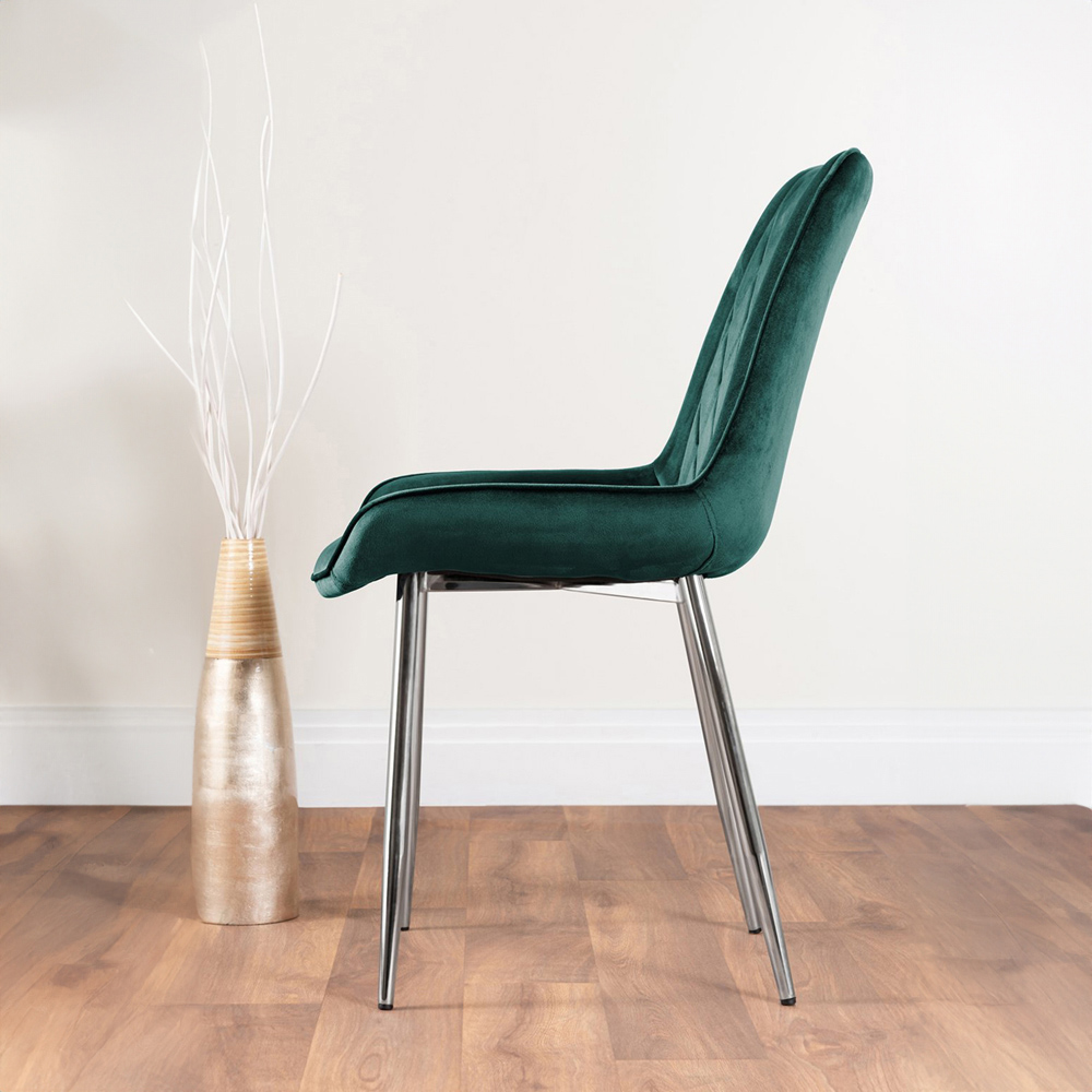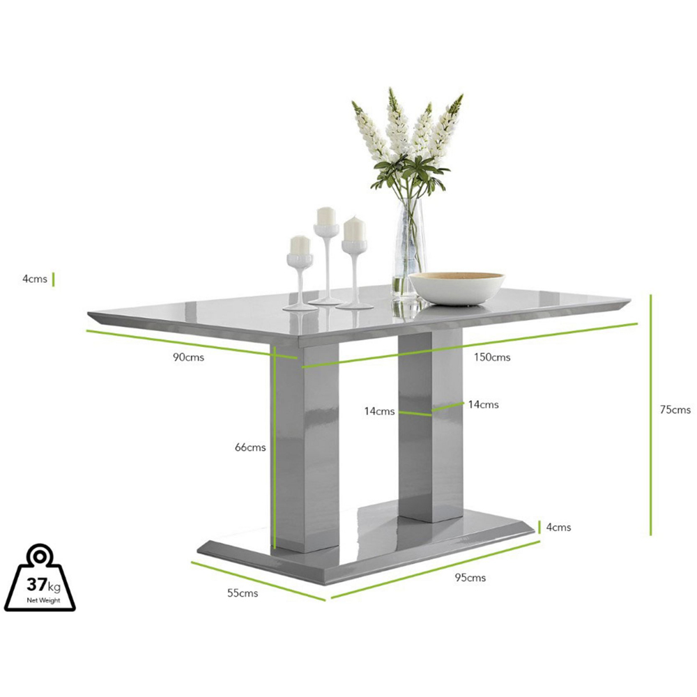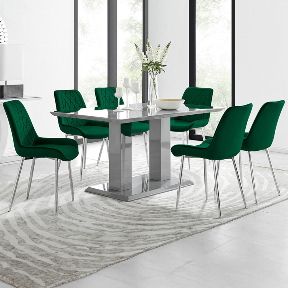 Upgrade your kitchen space with this Furniturebox Molini Cesano 6 Seater Dining Set Grey Gloss Green and Chrome. This elegant Molini dining table boasts a large 150 x 90cm surface, leaving plenty of room for dining with guests. Beautifully finished with a slick high gloss lacquer surface, the table stands out and would provide a modern look to any home. Its high gloss finish also makes it easy to maintain. This table also has two beautiful pillars for sturdy construction. The set also includes six luxurious velvet upholstered Cesano dining chairs, which tie off this set nicely. The Cesano chairs feature gorgeous textured diamond stitching with an ergonomically designed curved seat pad blending seamlessly with the supporting medium-high backrest. The chairs also have chrome legs, which adds a bold touch.