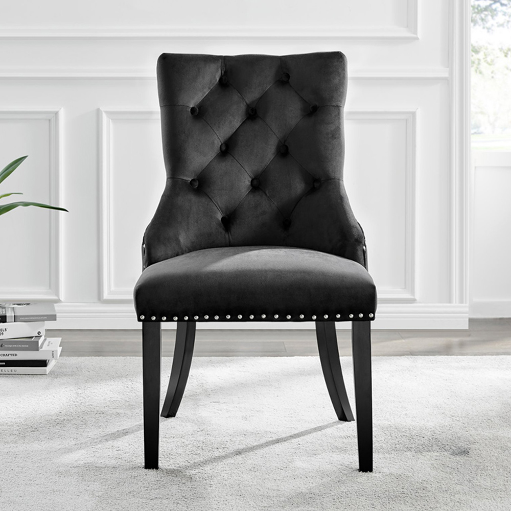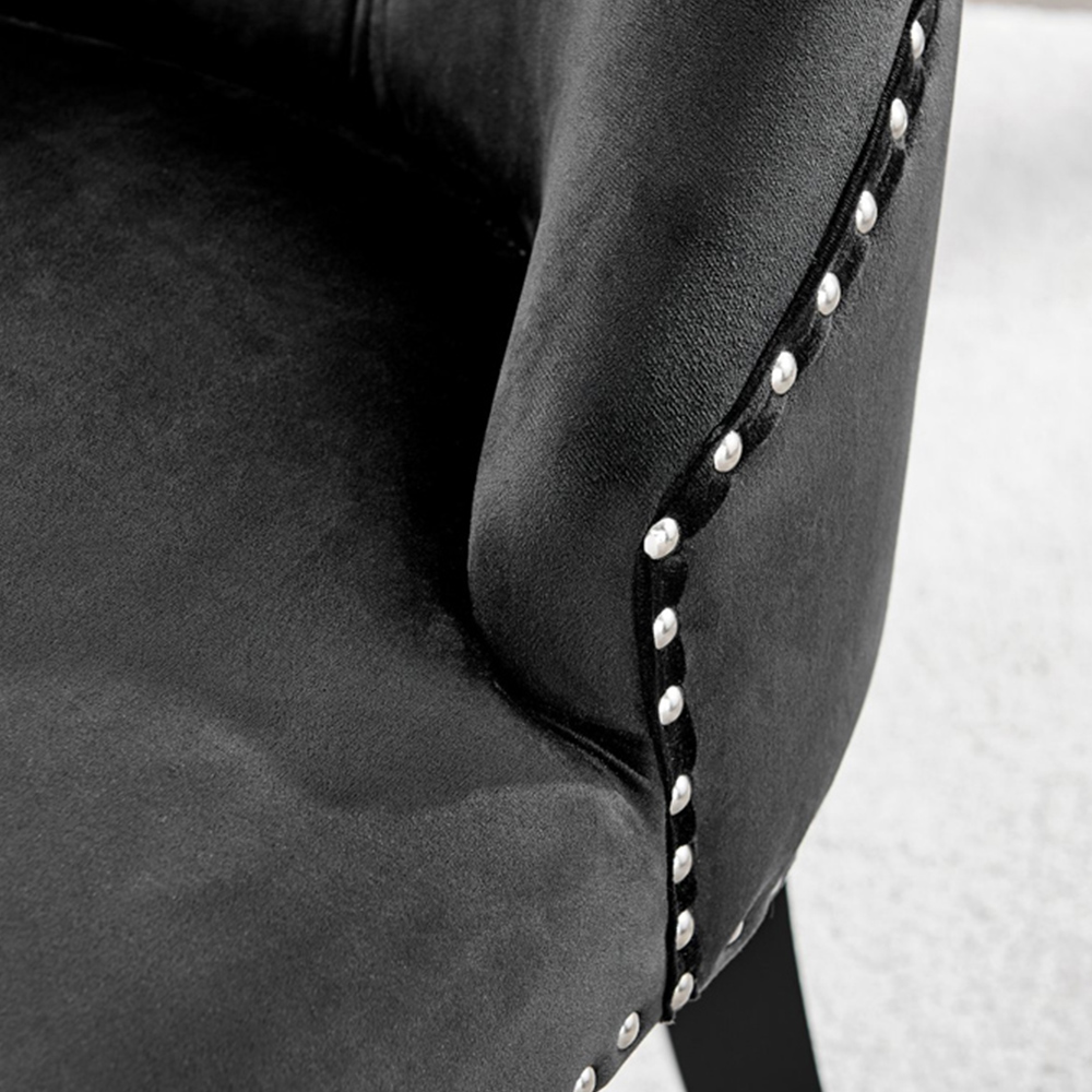 Enrich your dining experience with the Furniturebox Molini Kensington 6 Seater Dining Set Black Gloss. The dining table features a high-gloss lacquer finish with a sleek 150cm tabletop and a pillared structure with a stable base. The smooth black table is suitable for most interior spaces while the open space around the base makes it ideal for relaxed dining. This set includes six black chairs upholstered using soft velvet fabric with cosy padded seats and diamond stitching with button tufting for ultimate comfort. The Kensington dining chairs feature chrome knockers with chrome-button detailing along the trim and the back with sturdy black legs for stability and support. This dining set has a luxurious design that will effortlessly blend with all types of interior spaces.