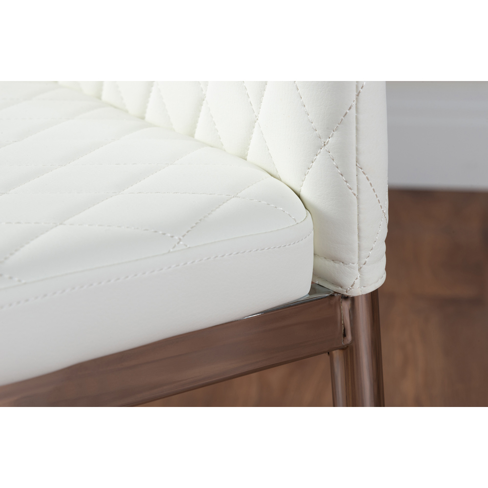 Redefine your dining experience with this Furniturebox Molini Valera 4 Seater Dining Set Grey Gloss White and Chrome. With its unique pillared structure and high gloss surface, the dining table has a modern but elegant design, comfortably seating up to four guests with its generous 120 x 70 cm surface. Paired alongside beautiful faux leather diamond quilted chairs, you can't go wrong with this set. The ergonomically designed chairs for maximum comfort and support are made from high-quality faux leather with a deep foam seat cushion and plastic feet to protect the floor from damage.