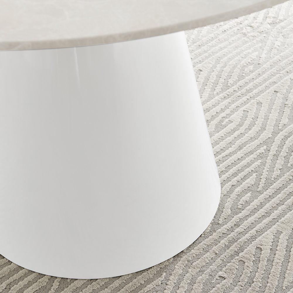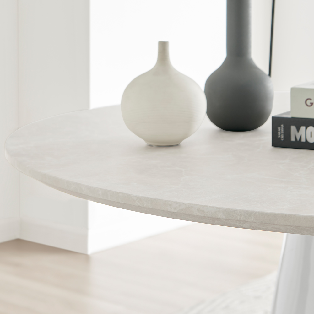 Upgrade your kitchen space with this Furniturebox Nova 6 Seater Round Dining Table Beige Stone Effect. This beige stone effect round dining table has a significant statement tapered central pillar. It has a perfect balance of round and straight lines, with an uncluttered and elegant dining table solution that will be a real talking point in any modern dining room. It comfortably seats four to six people and is constructed from wood composite with a luxury stone-effect finish. This table is easy to keep clean and durable and will stay gorgeous for years.