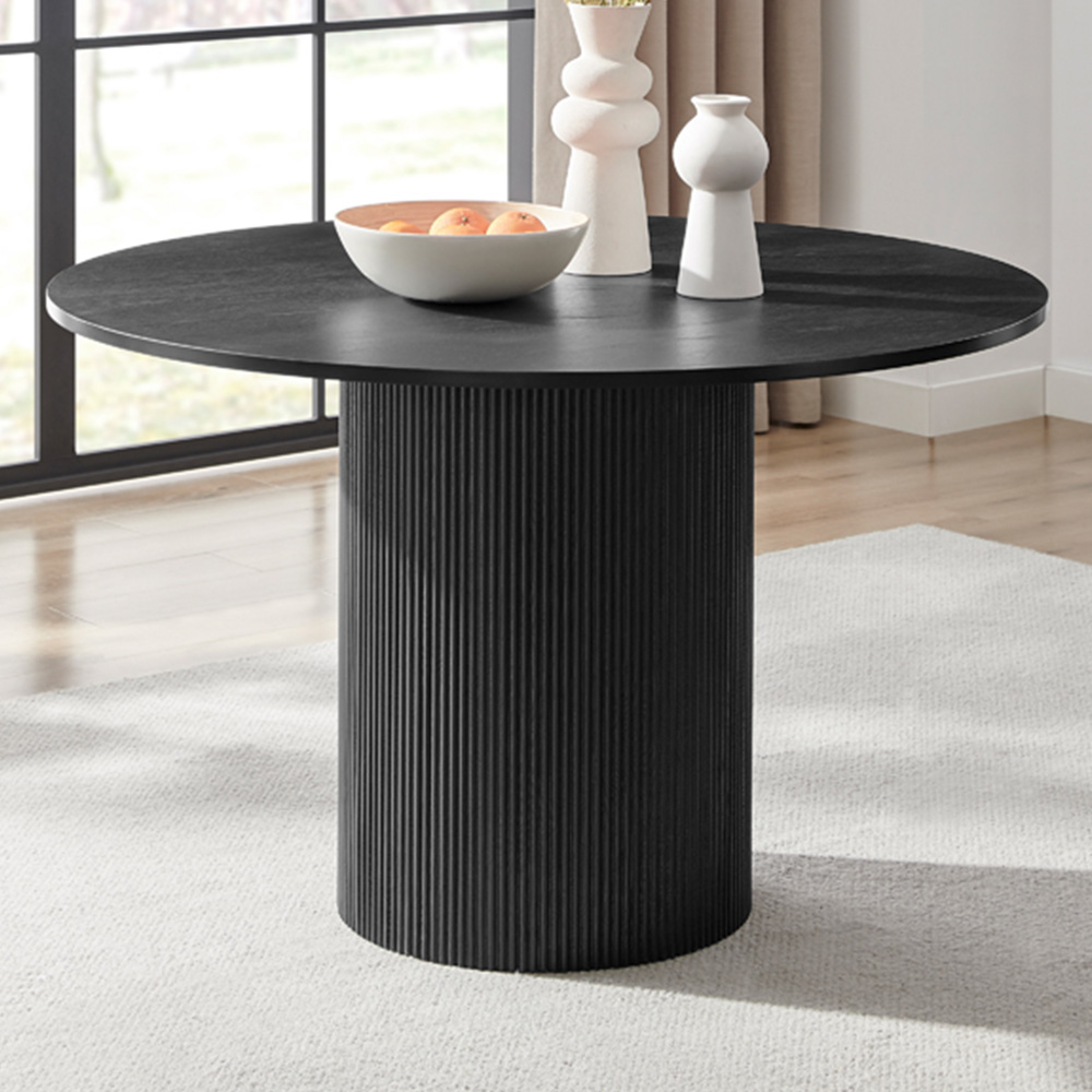 This Penrose black round wooden pedestal dining table is a simple yet elegant table for your dining room. 120cm in diameter, meaning it will comfortably seat 4, or a snug 6. Featuring a single slatted wood pillar leg, the Penrose is all about clean lines and simple shapes, drawing inspiration from Scandi and Japanese interior design. Perfect for family dinners and for entertaining guests. Constructed from sturdy and durable wood composite with a matte black scratch-resistant melamine veneer finish that has a wood grain effect, and a black painted edge. The Penrose dining table will look fab in any modern home with its sleek minimalist look. Matching side and coffee tables available, also in an oak effect. This product is FSCA certified, meaning the wood is sustainably sourced.