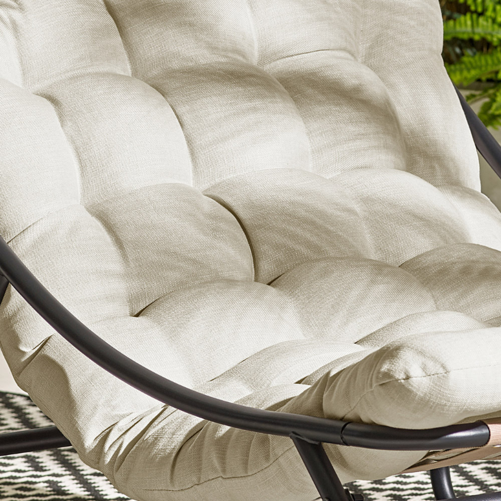 This Piasa outdoor garden rocking chair in black metal with cream cushion is the ultimate in outdoor relaxation. Get cosy and comfy in this simple curved seat design that will look great in a range of outdoor spaces, whether you have a balcony, patio or deck. This could work equally well in a book nook or bedroom corner. The black metal legs give it an industrial minimalist look but the squishy cream 'quilted effect' seat cushion keeps this piece looking soft and inviting. The frame is constructed from a sturdy black powder-coated steel frame, with flexible back strap slats to support the cushion, and resting on stylish curved trapezoid legs that will allow you to rock the chair. The plump cream cushion is splashproof (so if any spills occur, pick up the cushion and give it a firm pat on the underside to encourage the droplets to roll off). However, the cushion should not be left outside or in damp conditions. Store it somewhere warm and dry. If it does get wet then allow it to fully dry somewhere warm before you store them. This set includes a free water-resistant cover but please note, this is not fully waterproof and you should still store your cushion somewhere dry during wet weather and through winter. Assembly required - easy-to-follow instructions included.