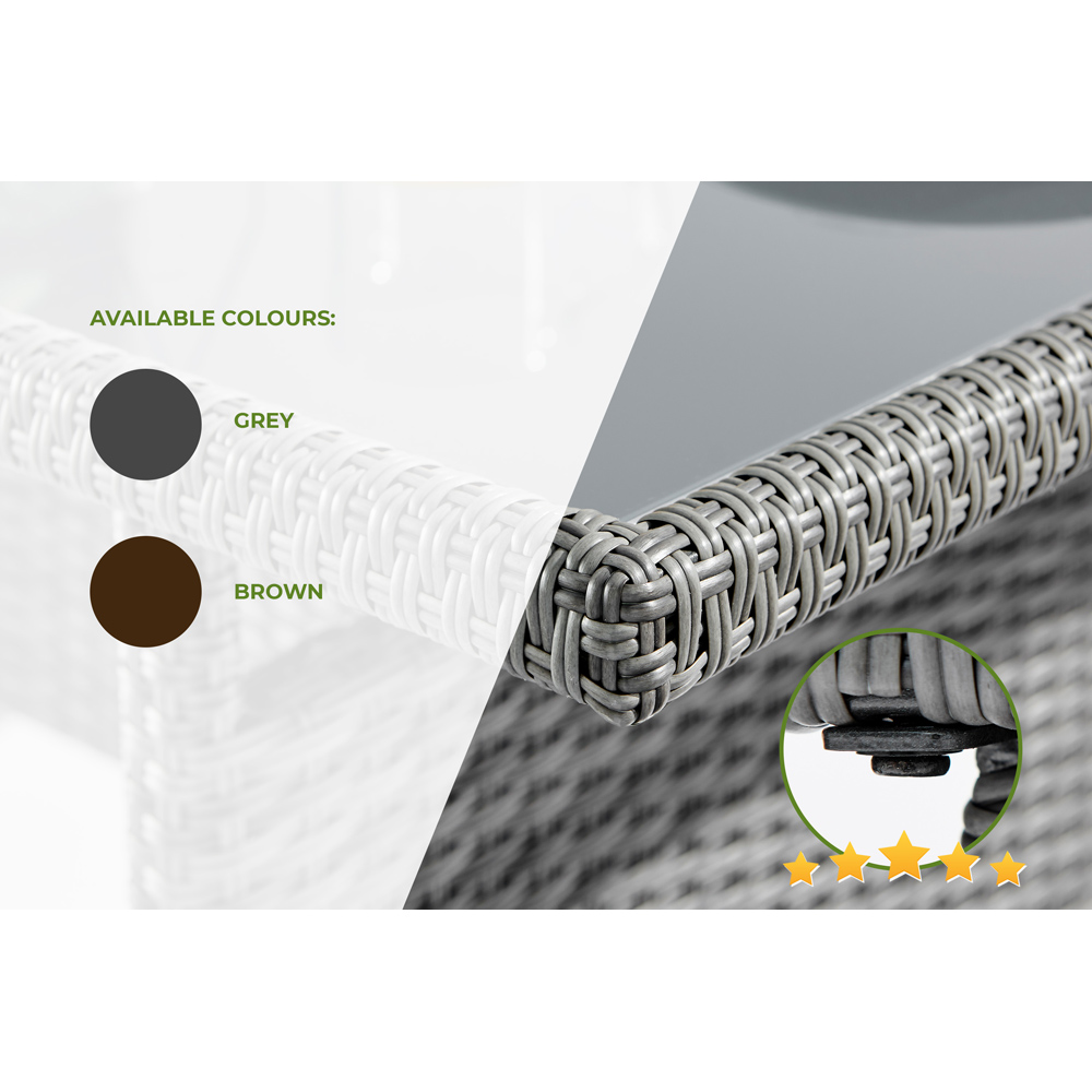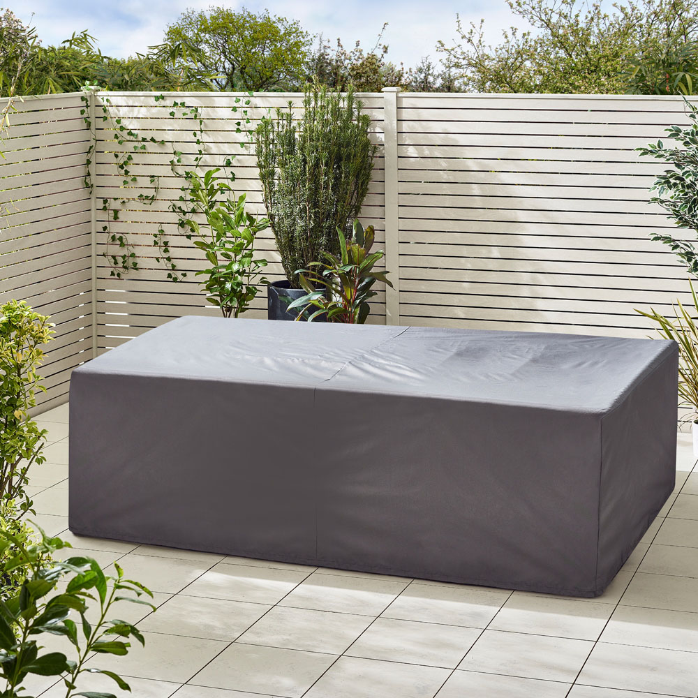 Add a lavish touch to your outdoor space with the Furniturebox Sierra Garden Dining Set. This grey set includes a corner sofa, an armchair, a two-seater bench and a dining table. It is ideal for large families, hosting BBQs or entertaining guests during special occasions. This set is crafted using grey rattan weave and it is UV and weather-resistant as well. The rattan has been hand-woven over a light metal frame making it lightweight and easy to move around. The rectangular dining table features a black tempered glass top with sturdy metal feet. It is a low-maintenance set that can be cleaned with a damp, soft brush or cloth regularly to keep it looking brand new. The 5cm thick cushions are comfortable and splash proof so if any spills occur, you can pick up the cushion and give it a firm pat on the underside to encourage the droplets to roll off. However, the cushions should not be left outside or in damp conditions. Store them in a warm and dry place. If they do get wet, then allow them to fully dry in the sun or somewhere warm before you store them. This set includes a free water-resistant cover but please note, this cover is not fully waterproof. Protect your garden furniture with our durable and waterproof covers. Explore our wide range of heavy-duty Garden Furniture covers to find the perfect fit for your needs.