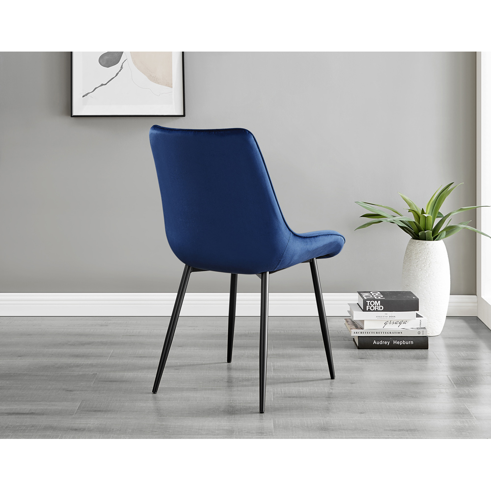 Upgrade your dining space Furniturebox Solo Cesano 6 Seater Dining Set Brown Navy Blue and Black. This set features a large rectangular table top which has plenty of space for laying out an impressive spread for friends and family. This 160cm 6 seat version is ideal if you love hosting guests for dinner. The dining table has an u-shaped black metal legs which provide an industrial dining set look. The brown wood veneer effect table top is not only beautiful but also practical and easy to clean thanks to its smooth surface which wipes clean. This is a wow factor dining table for your dining room. With a nod to the Mid-century modern design era, the Pesaro features gorgeous textured diamond stitching with an ergonomically designed curved seat pad blending seamlessly to the supporting medium high back rest. Sat atop elegant slightly tapered legs. The Pesaro is a perfect match to any dining table or use as a luxe vanity seat in the bedroom, as an occasional chair for the living area or to add a bit of luxury to your home office.