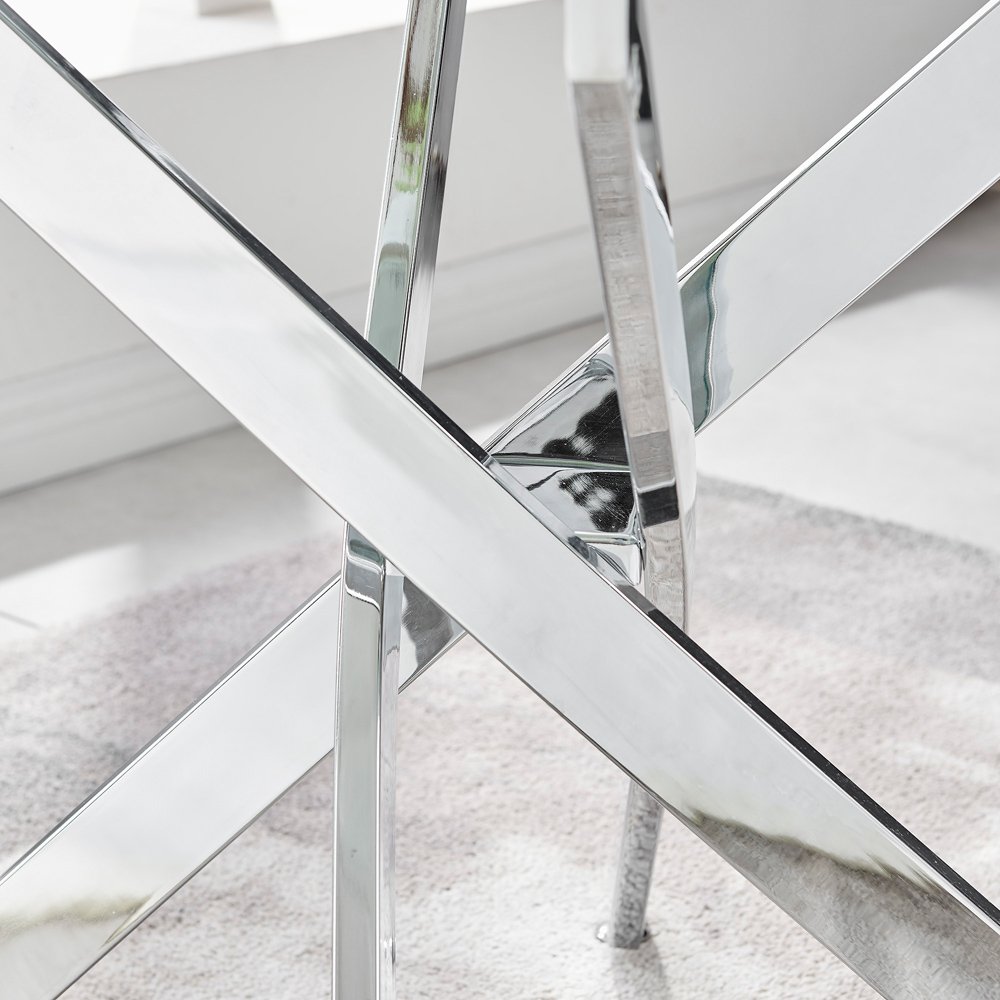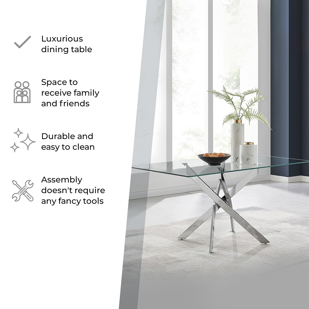 Redefine your dining experience with this Furniturebox Tavalo 6 Seater Glass Dining Table Chrome. This stylish table is designed for classy, modern interiors. The table's legs create a sleek nest shape, and the transparent glass top makes the room feel bigger. The perfect centrepiece for your dining room, this table's eye-catching design provides the illusion of space while enhancing natural light. Built for busy homes, the combination of chrome metal table legs and tempered glass is hardwearing and easy to maintain. Glass is a sturdy material that wipes clean - perfect if spillages are inimitable. You can seat up to six people at your Tavalo table. The 150 x 90cm bevelled top surface offers enough space to lay on an extensive buffet and gives each person ample space to sit without ever knocking elbows.