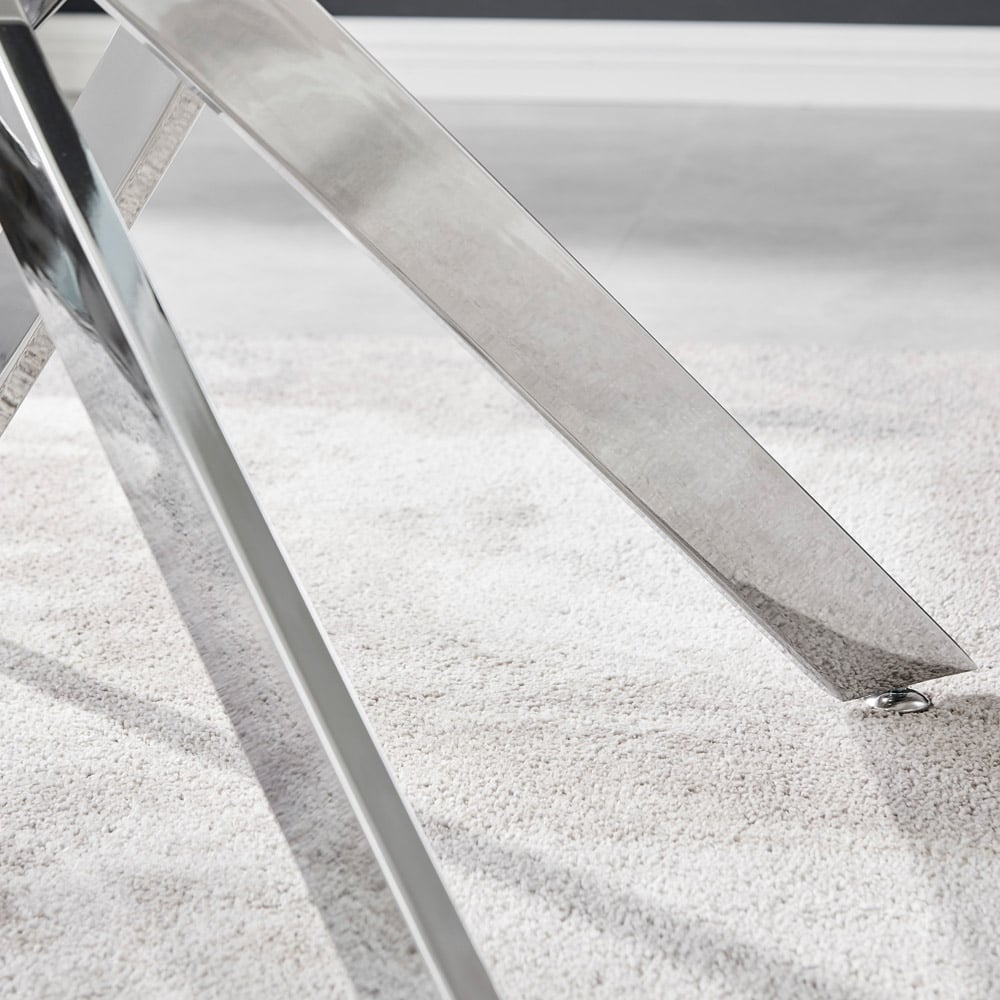 Elevate your living space with this Furniturebox Tavalo 6 Seater Marble Effect Glass Dining Table with Silver Legs. It sports a rectangular table top crafted from strong tempered glass with a flat edge. The table features a stylish marble effect table top to create a bright and spacious feel for your home. It sits on top of beautiful, sturdy silver-chromed legs in a stylish nested starburst design. A perfect blend of minimalist design and contemporary style, this six-seater table will transform your dining room instantly. Note: This tabletop is meant to imitate real natural marble. It has a warm natural stone colour that can look more grey, beige or brown depending on the room and lighting in which it's placed. The pattern and exact colour of each piece may vary to reflect the variations in natural marble. The piece you receive may not be identical to the piece photographed.