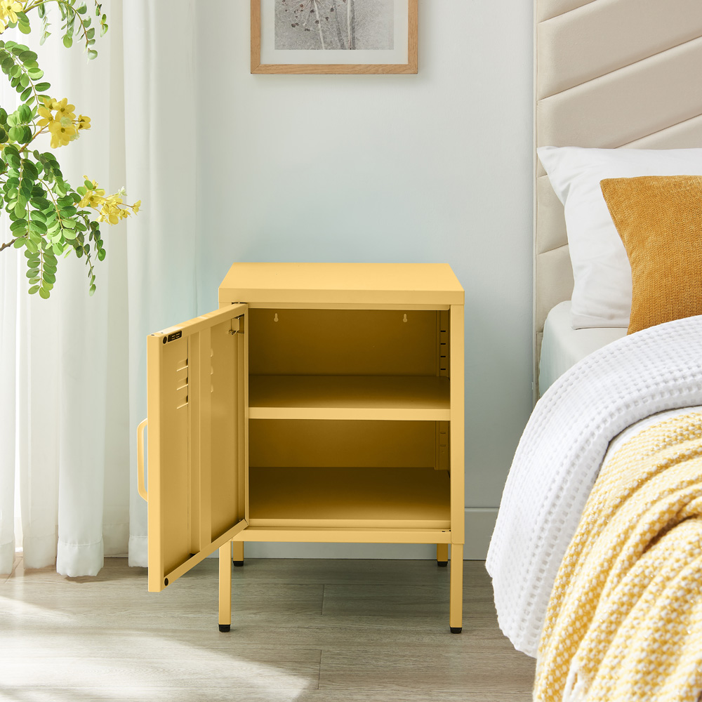Make a classic addition to your bedroom with this Furniturebox Theo Single Door Mustard Yellow Bedside Table. This is a classic locker storage design metal bedside table with a sleek, matte powder-coated finish. This stylish piece features a convenient door that reveals a spacious shelf with two tiers, offering ample storage for all your bedroom essentials. The flat top provides additional space for keeping items within easy reach. Perfect for adding a contemporary touch to any bedroom or using it as an end table in a living room, this versatile piece is a stylish storage solution for any modern home.