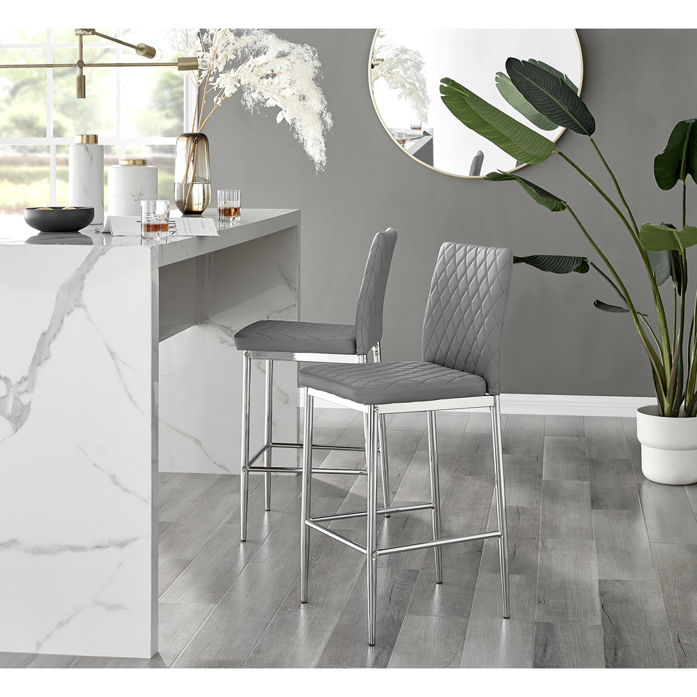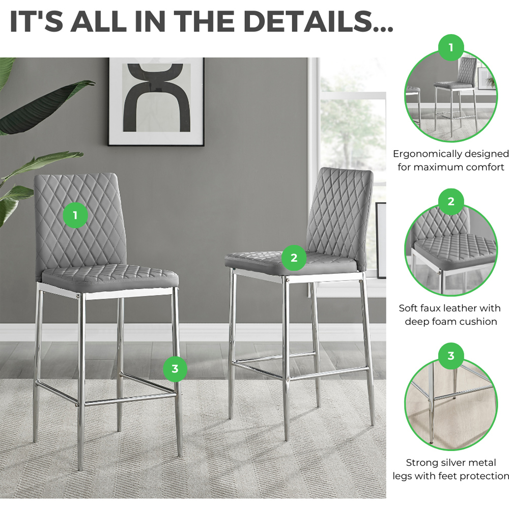 The Valera grey faux leather bar stool set from Furniturebox are sleek and elegant, perfect for any kitchen dining space. The tall silver chrome legs offer a strong base and the comfortable footrest allows maximum comfort. Upholstered in faux leather and finished with diamond pattern stitching the Valera bar stools would seamlessly fit in with any home decor. The soft touch and wipe-clean faux leather make the Valera bar stools perfect for families and dining areas whilst the stitched diamond design of the seat and back cushion adds a plush appearance to this ergonomically designed and stylish stool. Available in a range of other fabrics and leg colours!