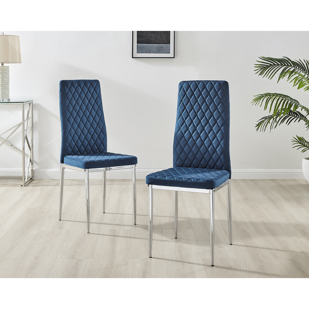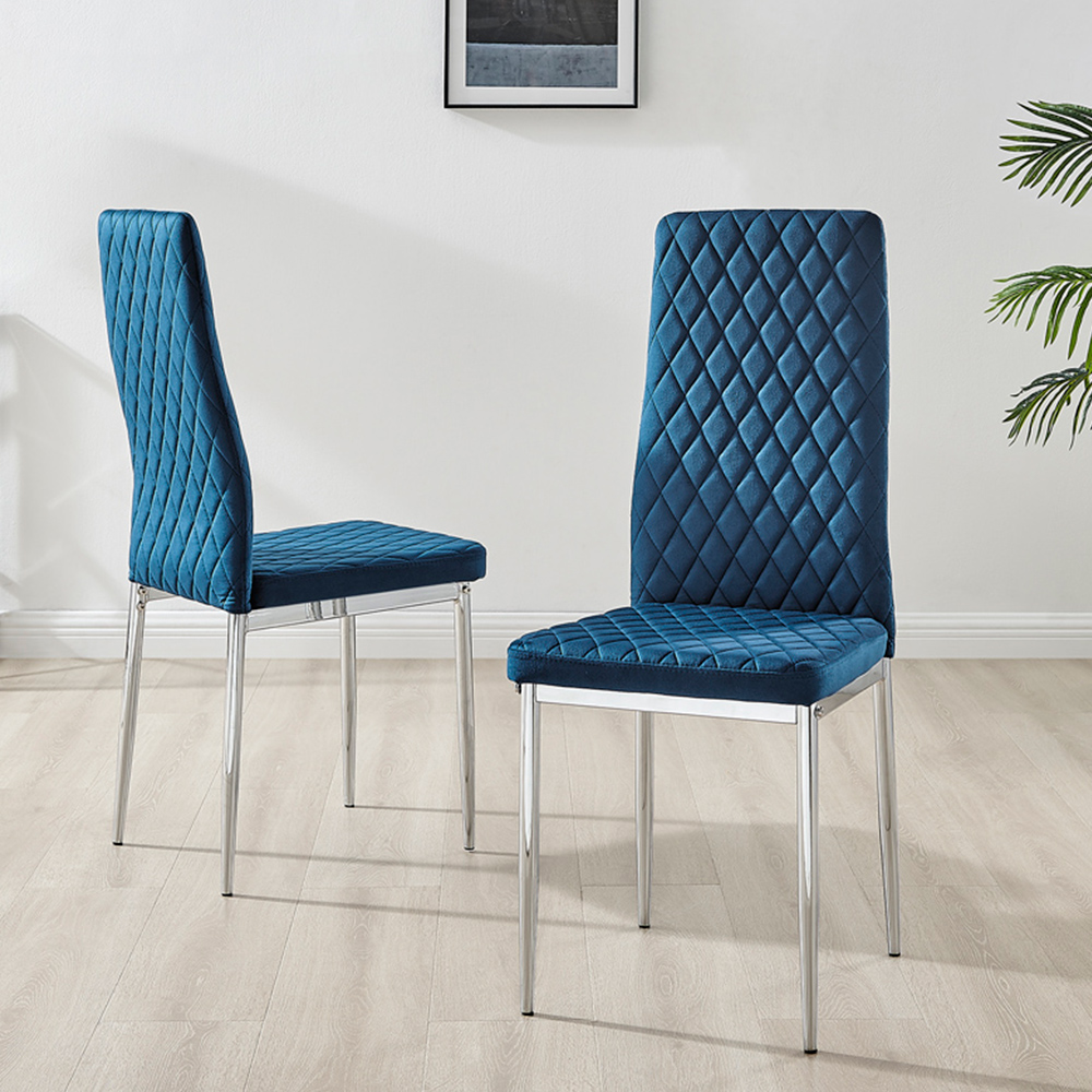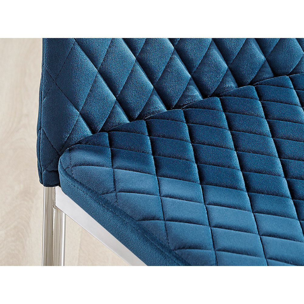Upholstered in soft touch navy blue velvet and finished with diamond pattern stitching the Valera dining chairs from Furniturebox would seamlessly fit in with most dining spaces, whilst not compromising on either style or comfort. The stylish shiny chrome silver leg and hatched velvet combination give this chair a contemporary edge, whilst its simple design allows for practical everyday usage. The chairs are made from high-quality durable velvet that's easy to keep clean and are ergonomically designed for maximum comfort and support. They feature a deep foam seat cushion and plastic feet to protect the floor from any damage!