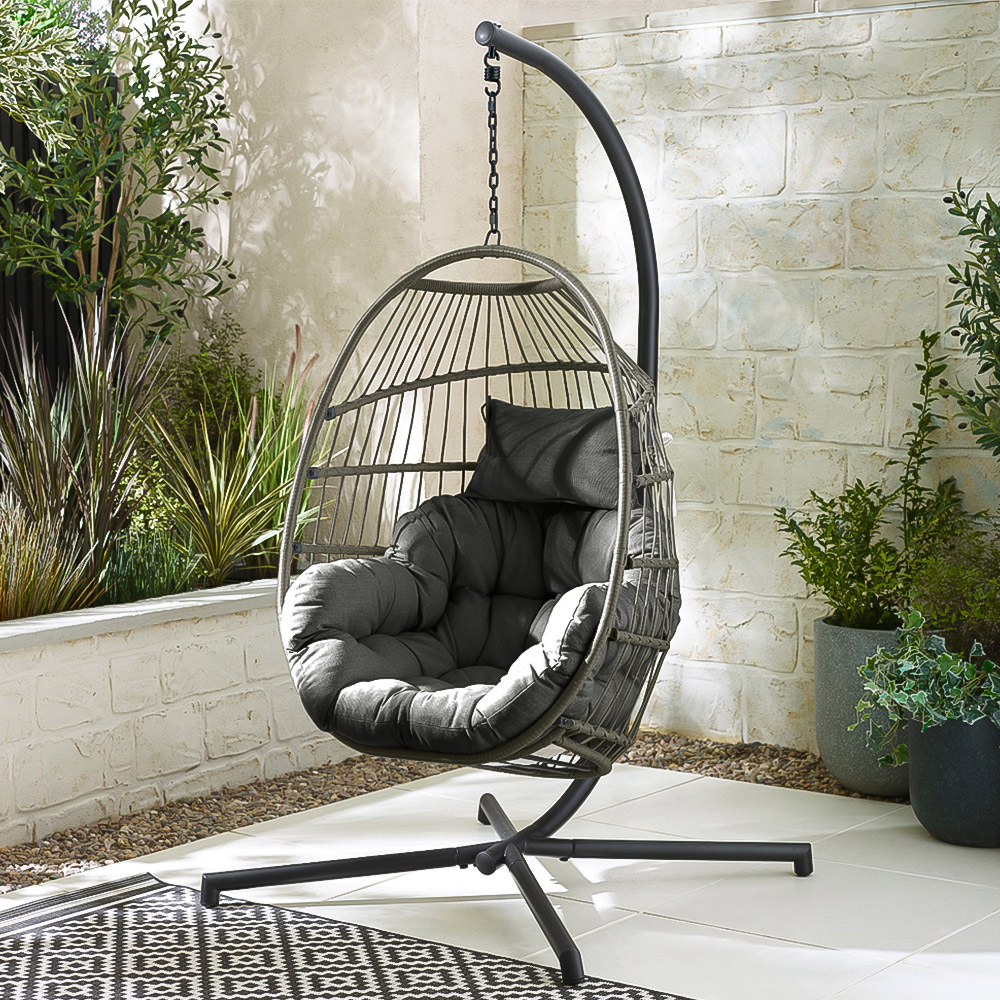 Enhance your comfort with the Furniturebox Veza Rattan Grey Hanging Egg Chair with Cushion. This stylish outdoor hanging egg chair in grey is perfect for creating a relaxing oasis in your garden, sunroom, or deck patio. The egg-shaped frame features a textured grey PE rattan weave for a natural appearance, complemented by dark grey cushions that provide cosy support. The seat is suspended from a sturdy black steel chain, which hangs from a black metal curved arm that is securely balanced on four feet. The feet also have black plastic non-scratch caps to protect your surfaces. This hanging egg chair adds boho industrial flair while offering serious comfort. Constructed with a robust black powder-coated steel frame, the seat basket is wrapped in PE rattan. The frame is UV and weather-resistant, ensuring it won't fade over time. The cushions are splashproof, so if spills occur, simply lift the cushion and give it a firm pat on the underside to encourage the droplets to roll off. However, it is recommended not to leave the cushions outside or in damp conditions. Store them in a warm, dry place, and if they do get wet, allow them to dry completely in the sun or a warm area before storing them. This set includes a free water-resistant cover, but please note that it is not fully waterproof. Be sure to store your cushions in a dry place during wet weather and throughout the winter months. It also comes with a one year warranty, allowing you to shop with peace of mind. Assembly is required, but easy-to-follow instructions are provided.