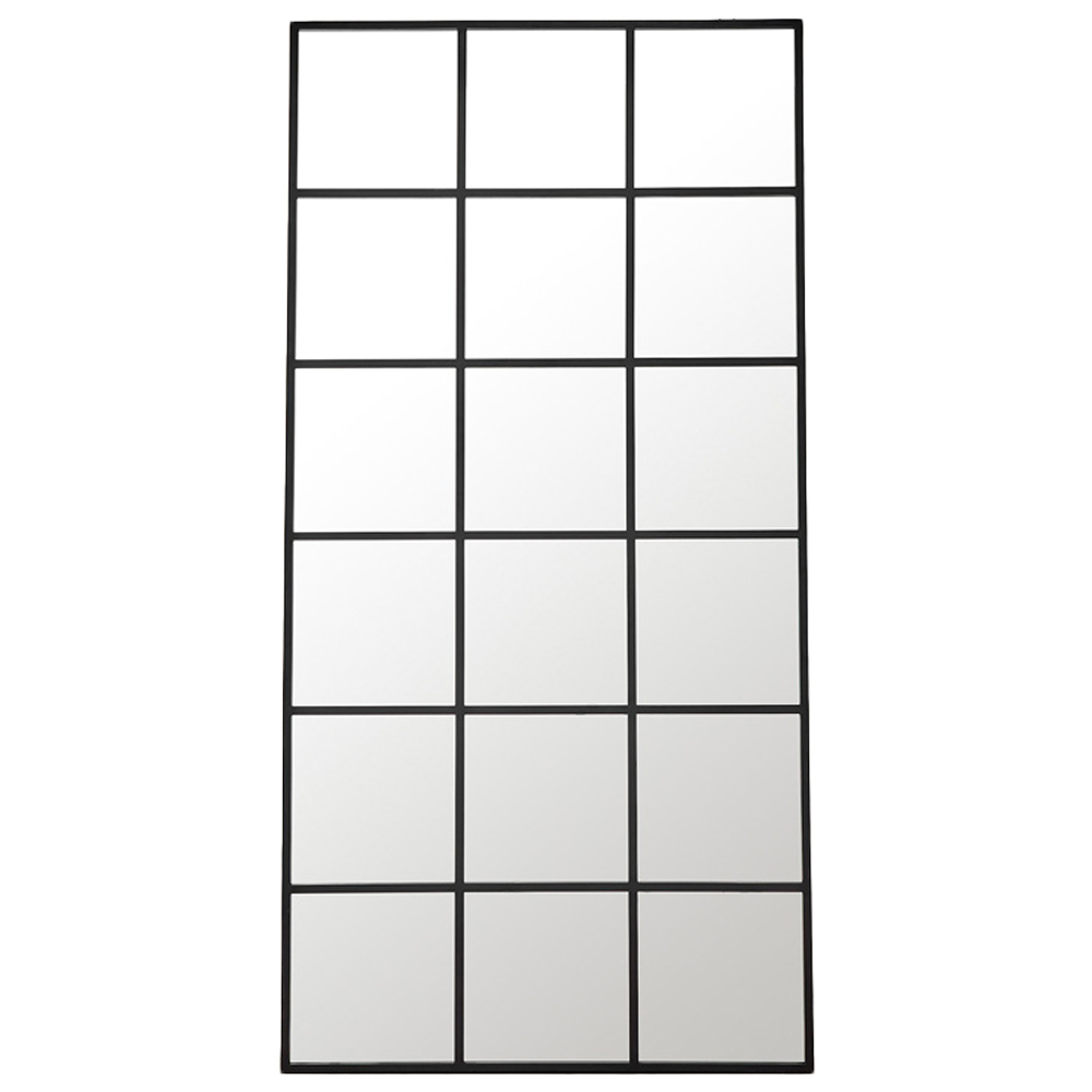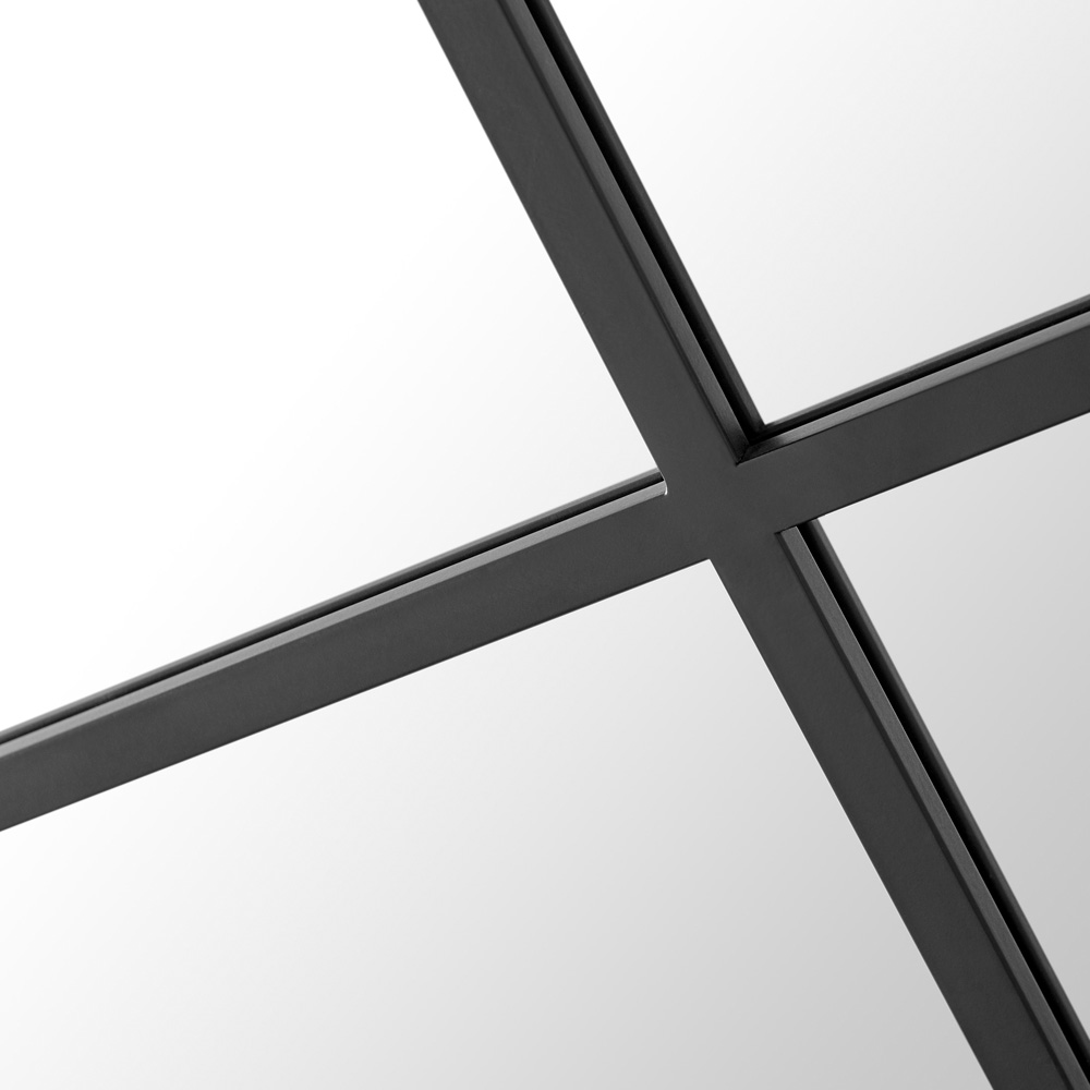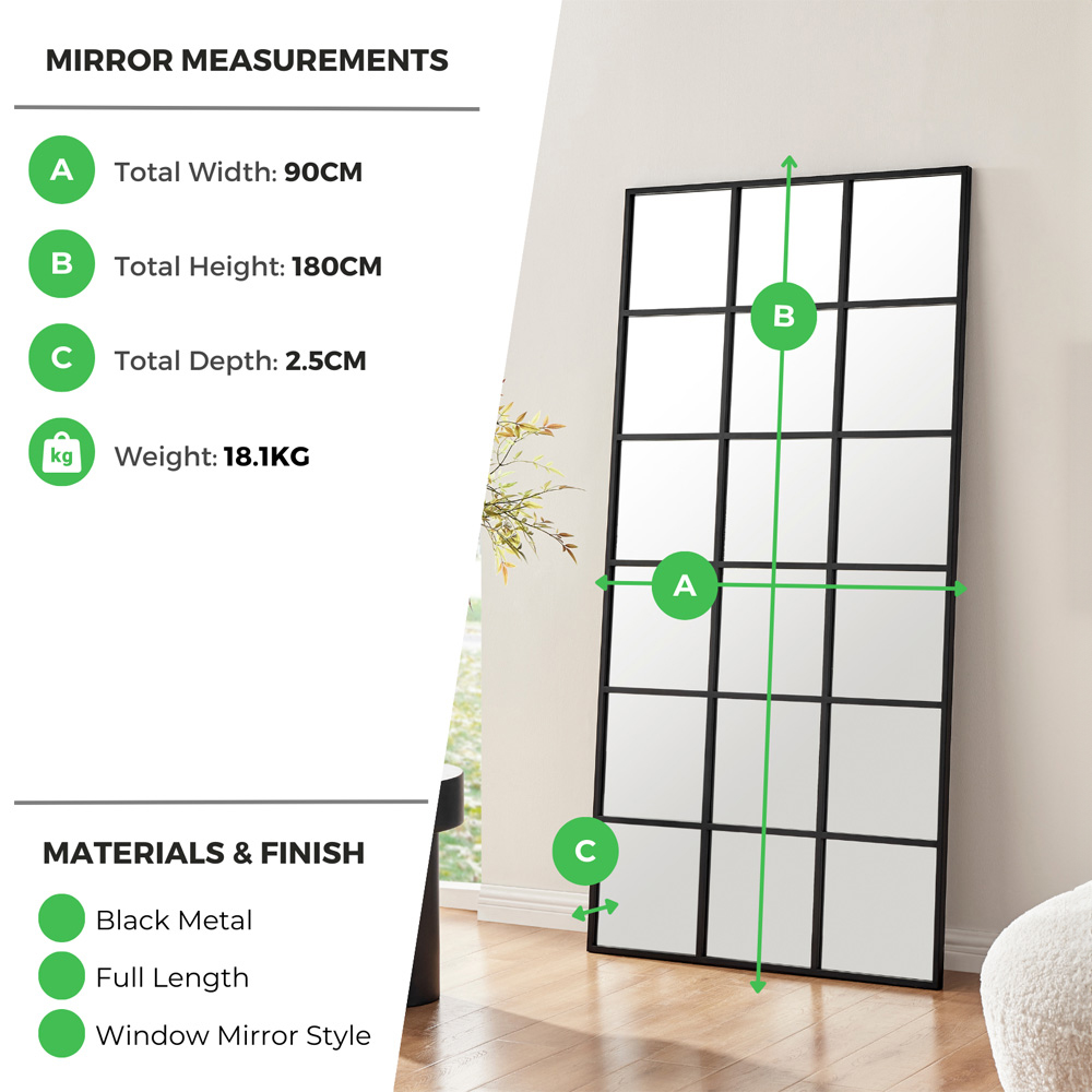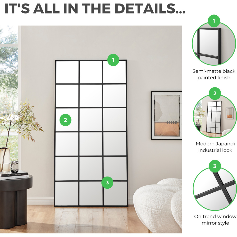 Enhance your home decor with the modern and chic Furniturebox Yuki Black Frame Full Length Wall Mirror Medium. This medium window wall mirror with a black metal frame is not just a stunning decorative mirror that will be a focal point for your room but also practical. Large enough to prop against a wall or hang, you can check your outfit or bounce natural light around your room. It can be used for hallways, bedrooms, living rooms or dining rooms (not suitable for bathrooms). The rectangular black metal frame and simple window frame effect give this a decidedly modern Industrial look with some 'Japandi' flair and will suit a range of home styles, from minimalist to boho or Scandi. It will even work well coupled with bold colours for a maximalist look. Constructed from sturdy iron with a semi-matte black painted finish to the frame. Vertical hanging only.