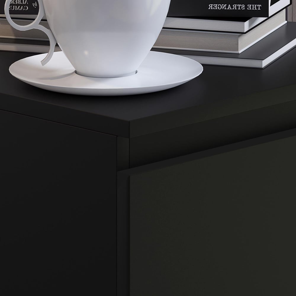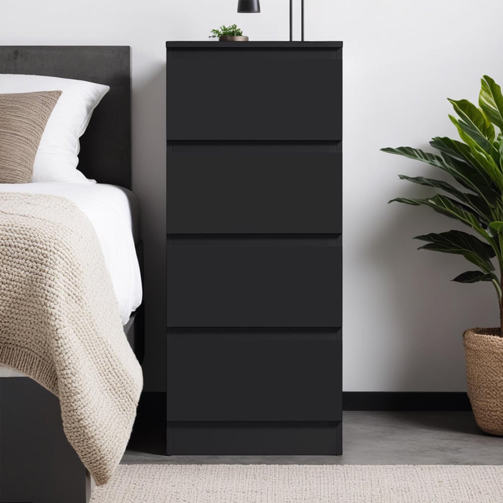 Elevate the style and functionality of your bedroom with our 4 Drawer Matt Black Chest of Drawers. Crafted with exceptional attention to detail, this stunning piece combines sleek, contemporary design with unparalleled storage capacity. The drawers have a no-handle modern design, and the strong melamine construction offers superior scratch and UV resistance, ensuring the chest maintains its pristine appearance for years to come. The true standout feature of this chest is the impressive depth of the drawers, providing 12cm of storage space. Requires home assembly and will measure 99cm tall by 40cm wide and 40cm deep.