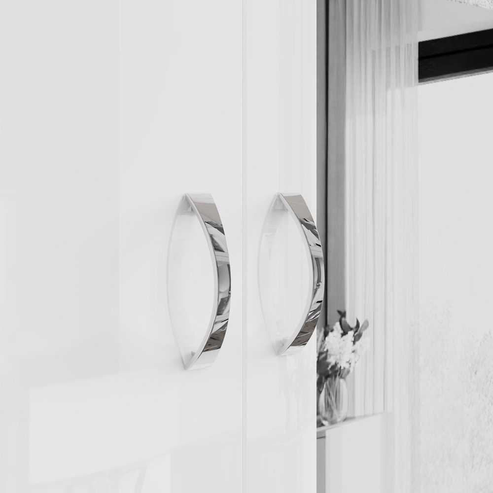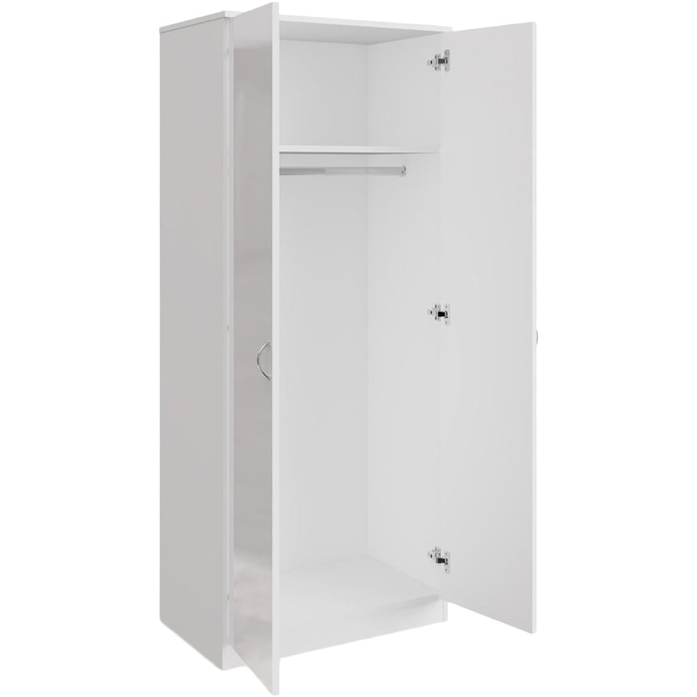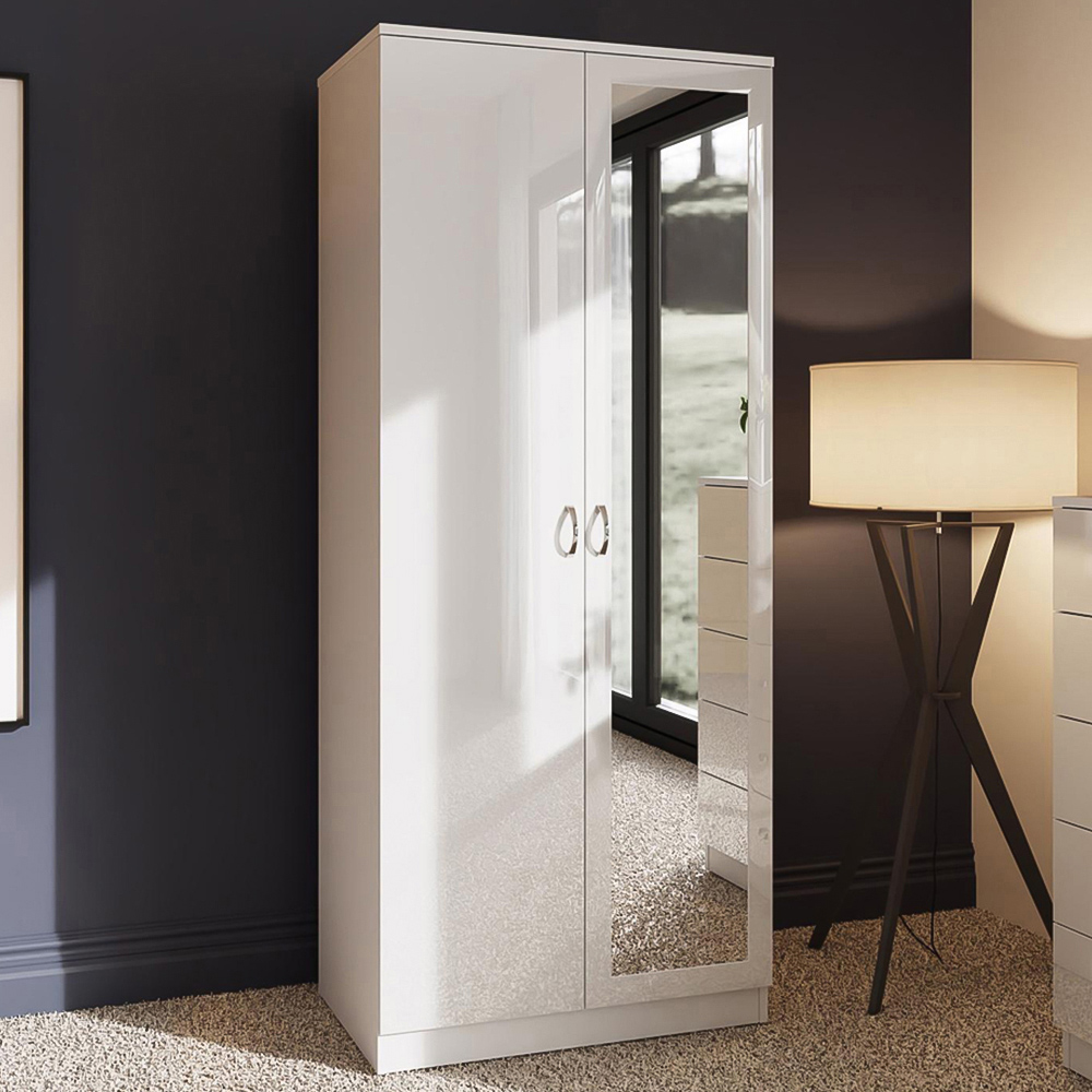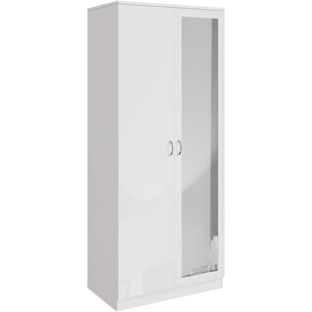 Simplify your mornings and declutter your life with the Chilton 2 Door Mirrored Wardrobe in White Gloss. This wardrobe is more than just storage, it's a solution to your daily dressing dilemmas. The large internal storage area, complete with a full-width hanging rail and overhead shelf, keeps your clothes organised and wrinkle-free, making it easy to find the perfect outfit. The combination of a sleek gloss white door and a full-length mirrored door not only adds a touch of elegance to your room but also provides a convenient spot to check your appearance. With easy-opening and closing doors, accented by polished metal handles and a stylish matt effect frame, accessing your belongings is effortless. Delivered flat-packed for fast and easy home assembly with clear instructions, and featuring a scratch and UV-resistant melamine protective coating.