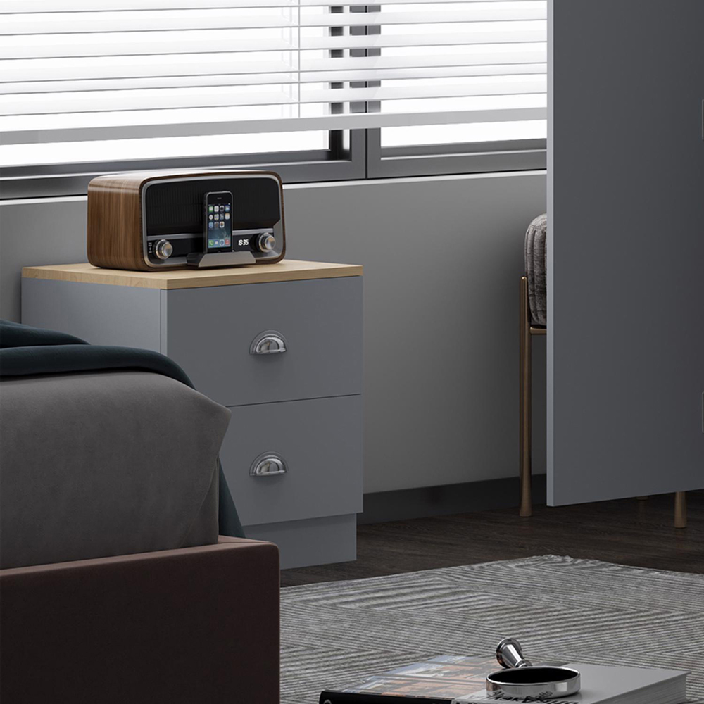 Simplify your bedtime routine and keep your essentials within easy reach with the Esher 2 Drawer Bedside in Grey Oak. Designed to streamline your nightly preparations, this bedside table features two full-width, deep drawers, providing ample space to store books, glasses, and other nighttime necessities, reducing clutter and promoting a more relaxed environment. The matt grey finish, contrasted by the stylish oak effect top, adds a touch of modern elegance to your bedroom. With chrome effect cup-style drawer handles and smooth bottom-fixed drawer runners, accessing your belongings is effortless. Delivered flat-packed with full, easy-to-follow assembly instructions, the Esher Bedside not only enhances your bedroom's organisation but also offers lasting style with minimal hassle.