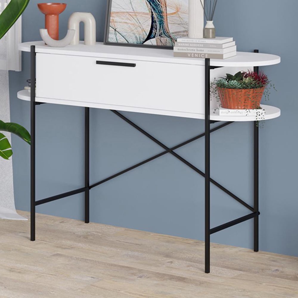 Looking to spruce up your home? This Single Drawer Otis Console Table is just what you need! This stylish piece combines modern design with practical functionality, making it a great fit for any room. The wide top is perfect for displaying your favourite decor, plants, or personal mementos, creating a cosy focal point in your entryway or living room. Plus, it has a full-length drawer for extra storage and two side shelves that are great for small plants, books, or magazines. With a sturdy metal handle for easy access and a durable black metal frame, this console table is built to last while adding a touch of charm to your space!