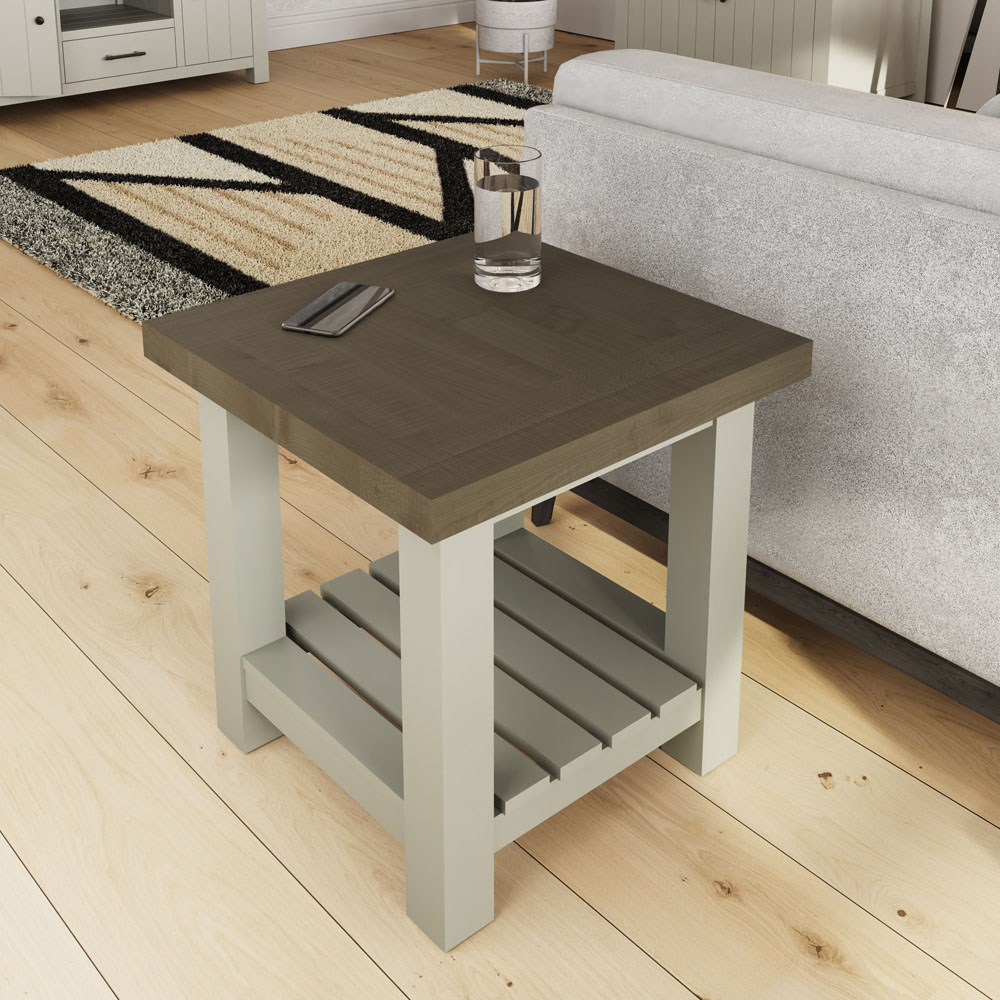 Introducing our exquisite reclaimed pine lamp or side table, a stunning addition to elevate any living space. Crafted with care and unmatched attention to detail, this masterpiece boasts a unique allure that will captivate your guests. Featuring a convenient panelled top and an under shelf, this versatile piece offers both stylish storage and display options. The top, lovingly painted in a driftwood hue, exudes a charming rustic appeal, while the rest of the table is elegantly finished in a captivating truffle colour, adding a touch of sophistication to any room. Embracing the natural variations inherent to reclaimed pine, each table showcases its own character, making it truly one-of-a-kind. From the subtle grain patterns to the delicate knots and imperfections, these distinctive features only serve to enhance its allure and ensure a truly authentic piece that tells a story. Not only does this reclaimed pine lamp or side table exemplify timeless beauty, but it also embodies sustainability and eco-consciousness by giving new life to otherwise forgotten materials. By choosing this table, you make a statement in support of ethical craftsmanship and contribute to a more sustainable future