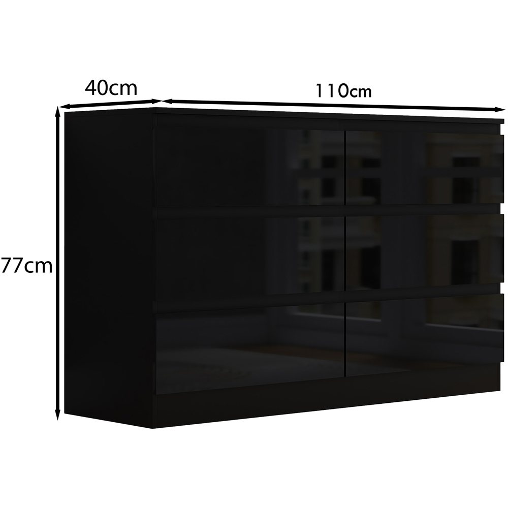 This 6 Drawer Wide 3+3 Chest Of Drawers in Black Gloss is a substantial piece perfect for those who need extensive storage without compromising on style. This chest features a practical 3+3 drawer layout, providing ample space with three wide drawers on each side. Each drawer showcases a lustrous black gloss finish, while the frame has a contrasting matt finish, creating an elegant visual appeal. With an internal drawer depth of 14 cm, this chest is ideal for storing a variety of items from clothing to bedding. Built to last, its scratch-resistant surface ensures durability and enduring beauty.