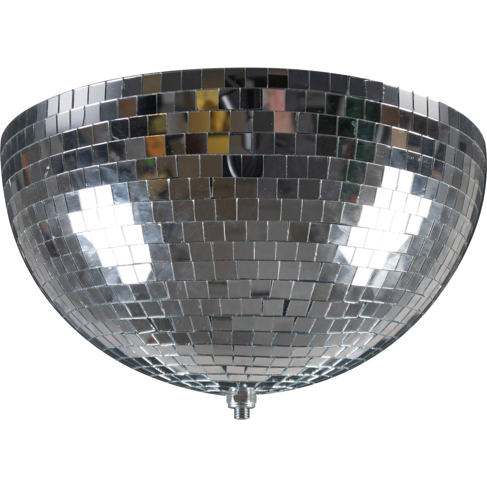 Add a vibrant touch to your interior space with the FX Lab Silver Half Mirror Ball with Built in Motor 20 inch. This half-mirror ball can provide a disco atmosphere to any party or gathering. It rotates at 1rpm and is crafted using lightweight material and covered with polished mirror glass facets. It features an integral motor that enables 360-degree ball rotation. A sparkle effect is projected onto the surface within range when a spotlight is directed onto the ball's surface. This half-mirror ball is an ideal solution for rooms or venues with lower ceilings. It has an integral bracket with two key slots on either side for permanently and safely fixing it to any wall or ceiling.