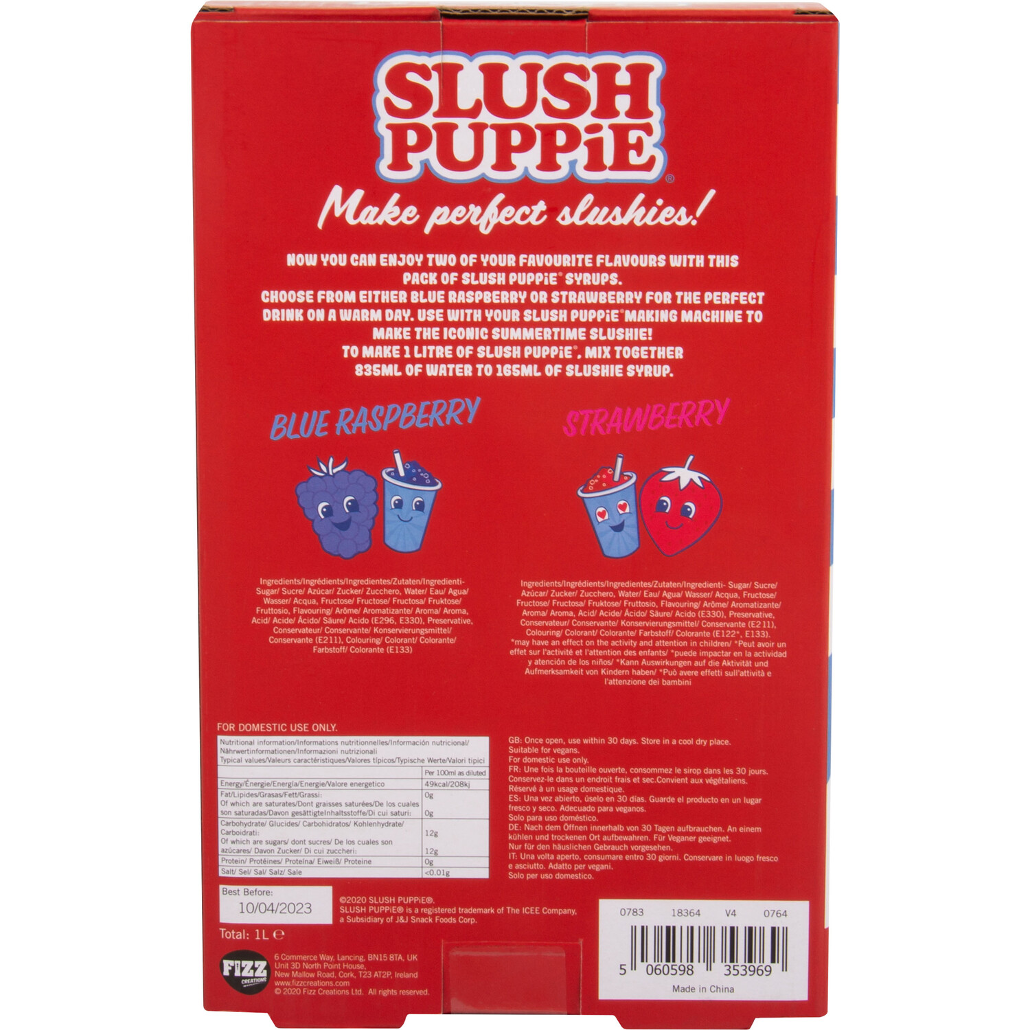 Now you can enjoy 2 of your favourite flavours of Slush Puppie at home with this pack of Slush Puppie Syrups. Choose from either Blue Raspberry or Strawberry for the perfect drink on a warm day or a retro refreshment at your next party.