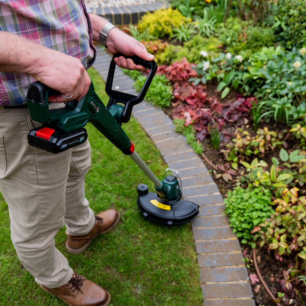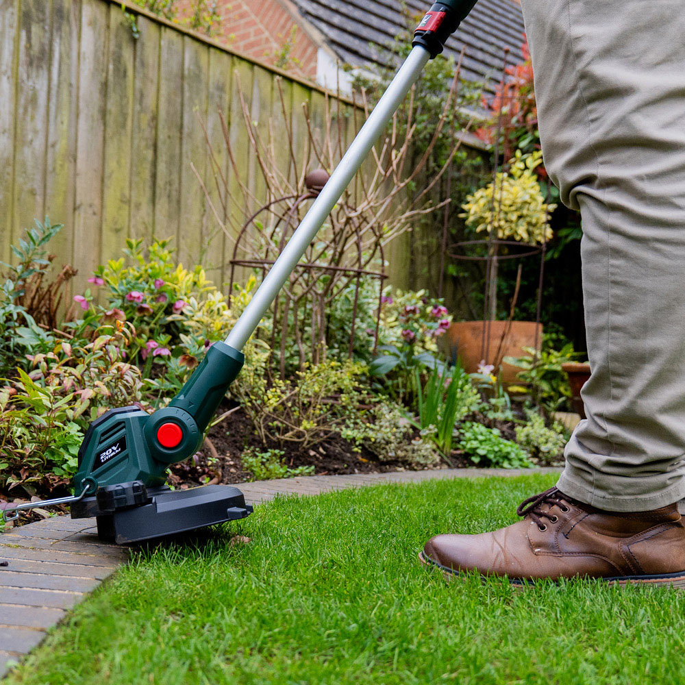 Give your garden the much-needed finishing touches with this 20V 30cm Webb Cordless Line trimmer. This trimmer features an easy and versatile design. It also features a rotatable rear handle, offering comfortable manoeuvring and control at various angles. The telescopic shaft is adjustable to different lengths and provides ergonomic benefits and varying heights for convenient use. It also has a plant protector edging function, which ensures delicate plants and structures are safeguarded while delivering a tidy finish. Because of its powerful and reliable brushed motor, the trimmer offers a consistent and dependable performance throughout trimming sessions. With a 20V 2Ah battery and charger, it possesses ample power for up to 28 minutes of cordless operation. Also, with a 30cm cutting width and an 8000 RPM operation, the trimmer can cover larger areas with each pass, while the 1.4mm line diameter enables effective trimming.