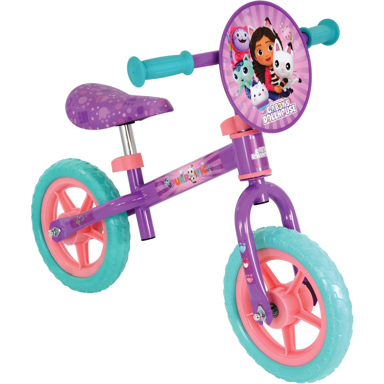 The perfect first bike for any Gabby's Dollhouse fan, with colourful character graphics, the Gabby's Dollhouse Balance Bike helps to develop core coordination, strength and skill to allow 'push off' and balance via freewheeling. The wide EVA moulded wheels with mag wheel inner provide extra stability, and the deep tread tyres offer a firm yet comfortable ride with excellent grip. Both saddle and handlebars are adjustable in height to suit children as they grow and gain confidence, and a soft saddle and hand grips provide additional comfort whilst learning.