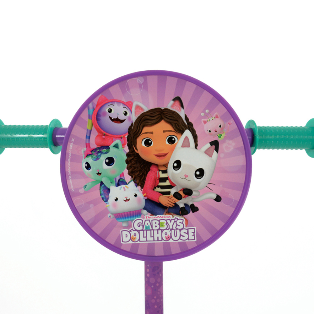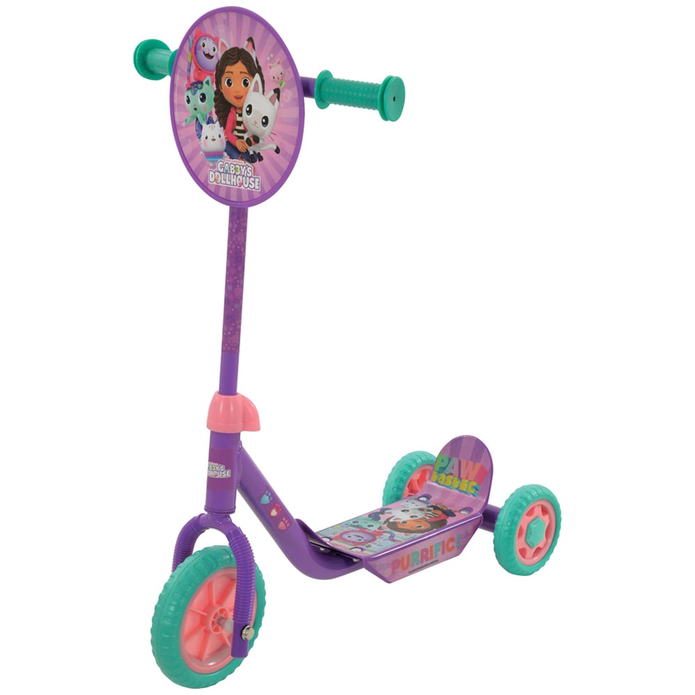 An ideal first scooter for any little adventurer, the Gabby's Dollhouse Deluxe Tri-Scooter boasts an array of features. With brightly coloured decals, shaped plaque and components, the officially licenced three-wheel scooter with character favourites is ideal for visual development! The fully printed anti-slip footplate not only ensures safety but features cute iconic graphics and has smooth sides to prevent knocks to ankles. The wheels are constructed from wide puncture-proof tyres with deep tread ensuring both optimal grip and stability for riders getting the hand of scooting. For additional safety and durability, the forks are protected and the rear axles are covered to prevent injury. The handlebar adjusts in height as riders grow and sports a cute custom-shaped character plaque and stem wrap. Suitable for riders up to 20kg.