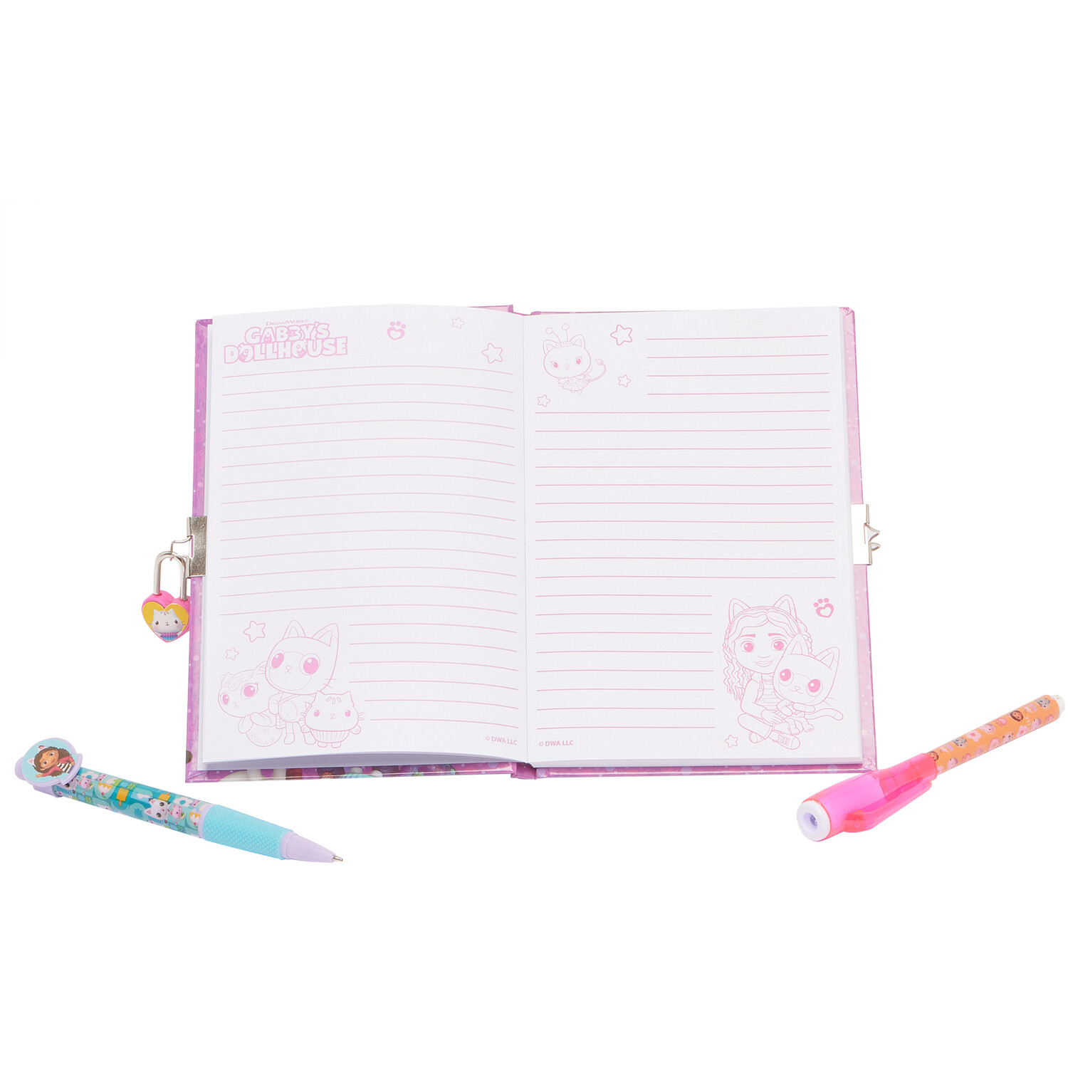 The Gabby's Dollhouse Secret Diary Set is the perfect collection for fans of the Netflix show Gabby's Dollhouse. The set includes a secret diary with a lock and key, pens, and stickers, all printed with Gabby's Dollhouse-inspired graphics. The set also includes a UV light to reveal secret messages you write! It's sure to keep kids occupied and encourage creativity.