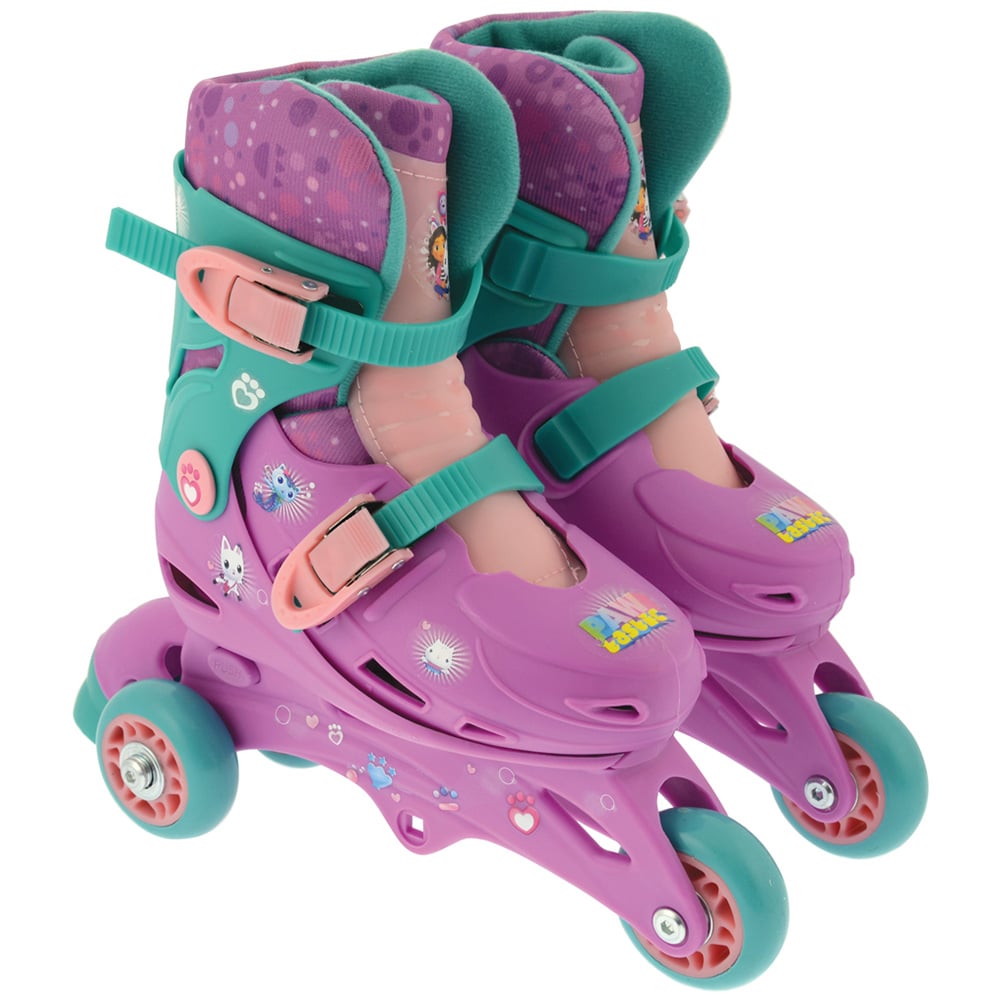The perfect 2-in-1 skates for beginners to experts - meow-mazing! Decorated with beautiful Gabby's Dollhouse graphics, these skates convert from tri-skates to in-line skates as confidence and ability improve. With durable PP shell and PVC wheels with 608z bearings for long-lasting fun. With safety in mind, the skates also feature a durable rear brake block for swift stopping while the pivoting heel cuff flexes with the foot for improved comfort and support, and the colourful sock keeps toes cosy. Ideal for growing children, the skates feature double ratchet-adjusting straps allowing for tailor-made comfort and secure fit across four sizes 9-12.