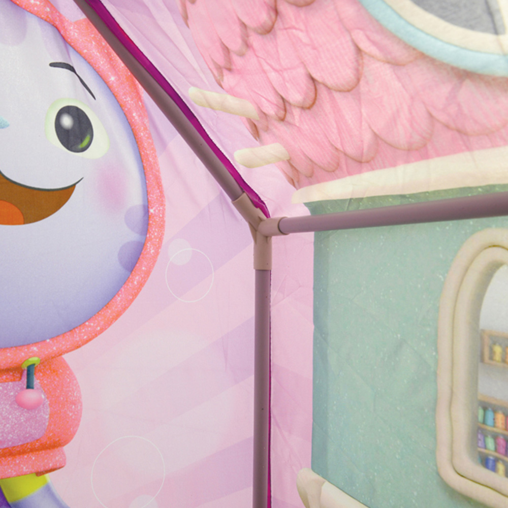 Let imagination, creative play and adventure follow you with the Gabby's Dollhouse Wendy House Tent. Suitable for ages three years, this is the perfect playhouse for children as they start to explore imaginative play and independence. Decorated with colourful character graphics, this playhouse comes complete with a ventilated closed top, tie-back door, and durable polyester and PVC materials as well as water resistance, perfect for any Gabby fan to immerse themselves in play indoors or outdoors. Easy to assemble; the tent is a one-piece design which is shaped by inserting the adjoining PVC poles through ready-made channels. The whole product folds down to a compact size for easy storage. It also comes with a carry bag ideal for transporting to sleepovers and holidays. Dimensions: H 105 x W 70 x L 90cm.