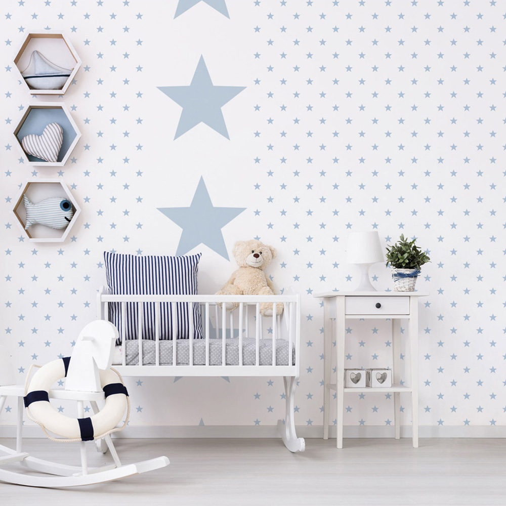 Make a statement with a bold style using this Deauville 2 Wallpaper from Galerie. Featuring large light blue stars across a crisp white background, it is perfect to add a touch of stars to your living space. With a washable high-quality finish, this wallpaper is wet removable for easy relocation. Method: Paste the Wall.