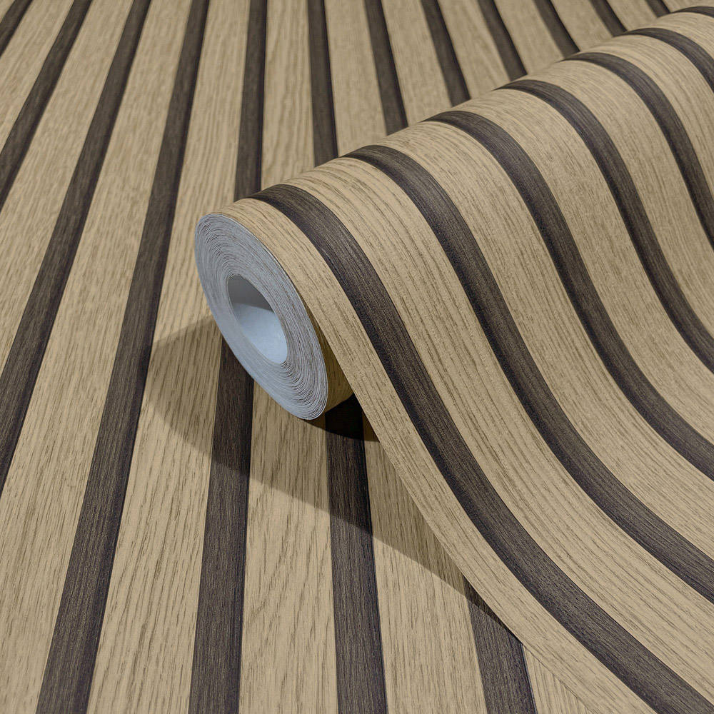 Introduce a touch of timeless elegance to your space with the Galerie Industrial Effects Panelled Beige and Dark Brown Wallpaper. This captivating wallpaper mimics classic wooden interiors to create a timeless design. Featuring a striking striped and panelled motif, it will add sophistication and charm to any wall and will instantly revitalise any room with its modern and refined aesthetic.