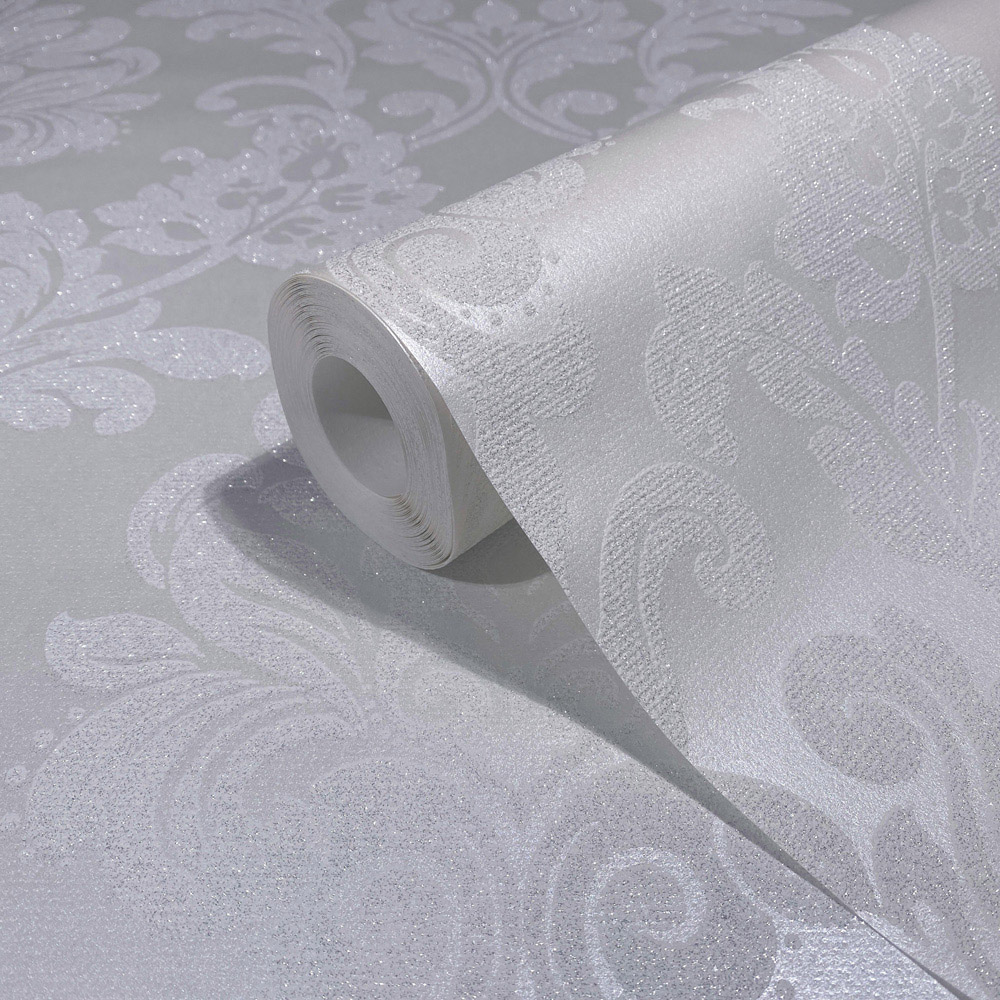 Complete your renovation with Galerie Industrial Effects Pearl White Wallpaper. This gorgeous white wallpaper features a pearl finish, with a traditional large feathered demask which is in a raised texture alongside silver glitter within the pattern. This wallcovering is sure to brighten up and interior whilst bringing an air of elegance.