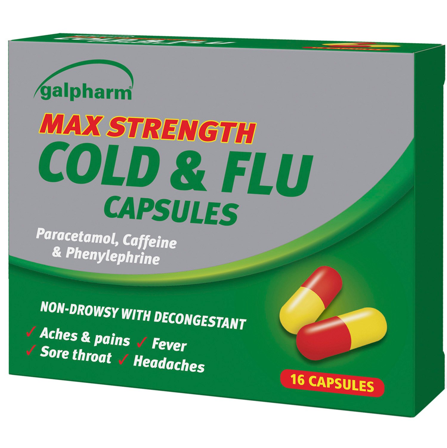 Fight off the symptoms of cold and flu with Galpharm Max Strength Cold & Flu Capsules, providing fast acting relief from aches, pains, sore throat, headaches, and fever. Fighting off fatigue and drowsiness, these max strength capsules will have you feeling like your usual self again.