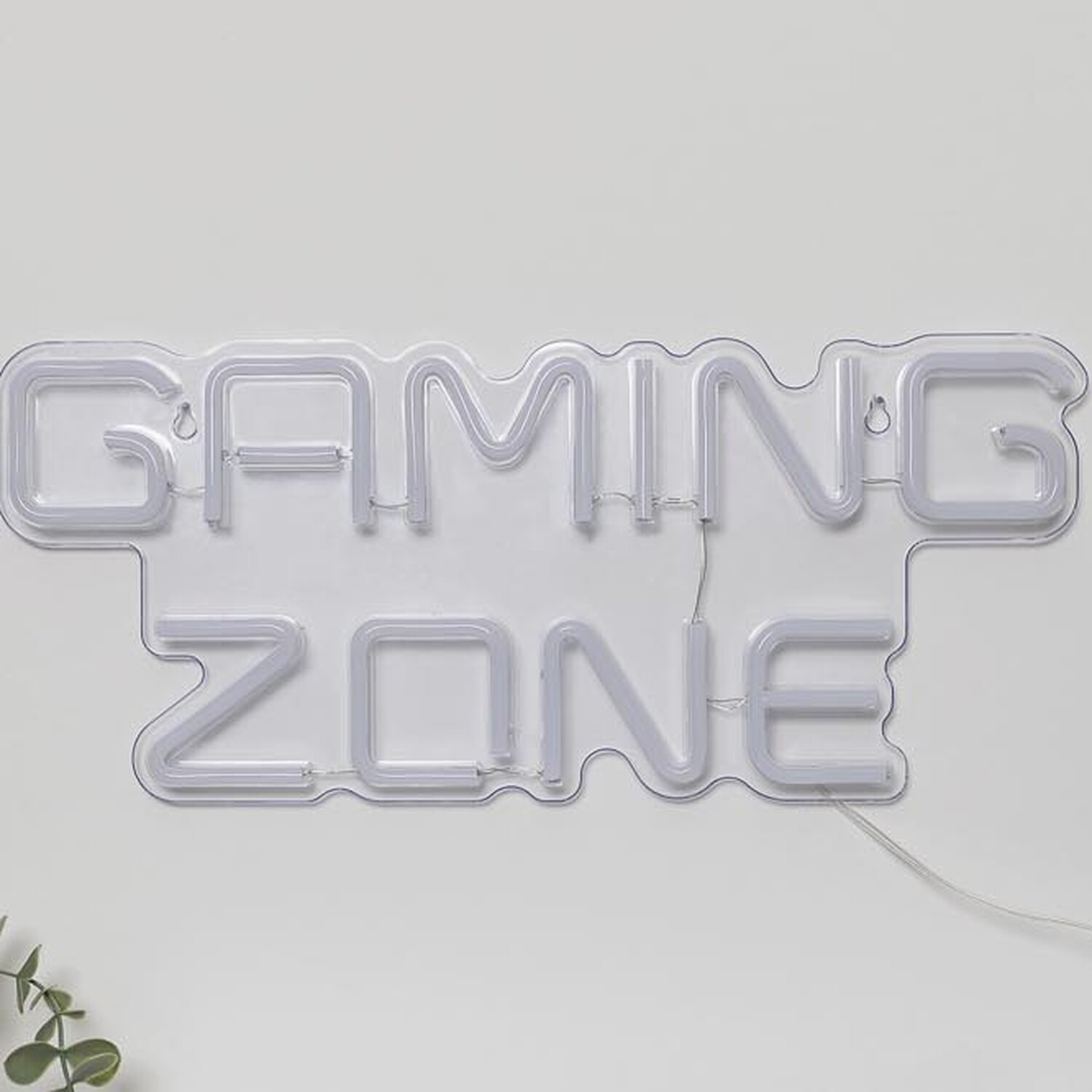 Making the perfect addition to your gaming den, study or living room, this Gaming Zone LED Neon Sign is guaranteed to get you in the playful spirit and ready to game. This trendy neon light is shaped into curling writing that reads 'gaming zone' and will emit a bright light to add a little fun to your decor.