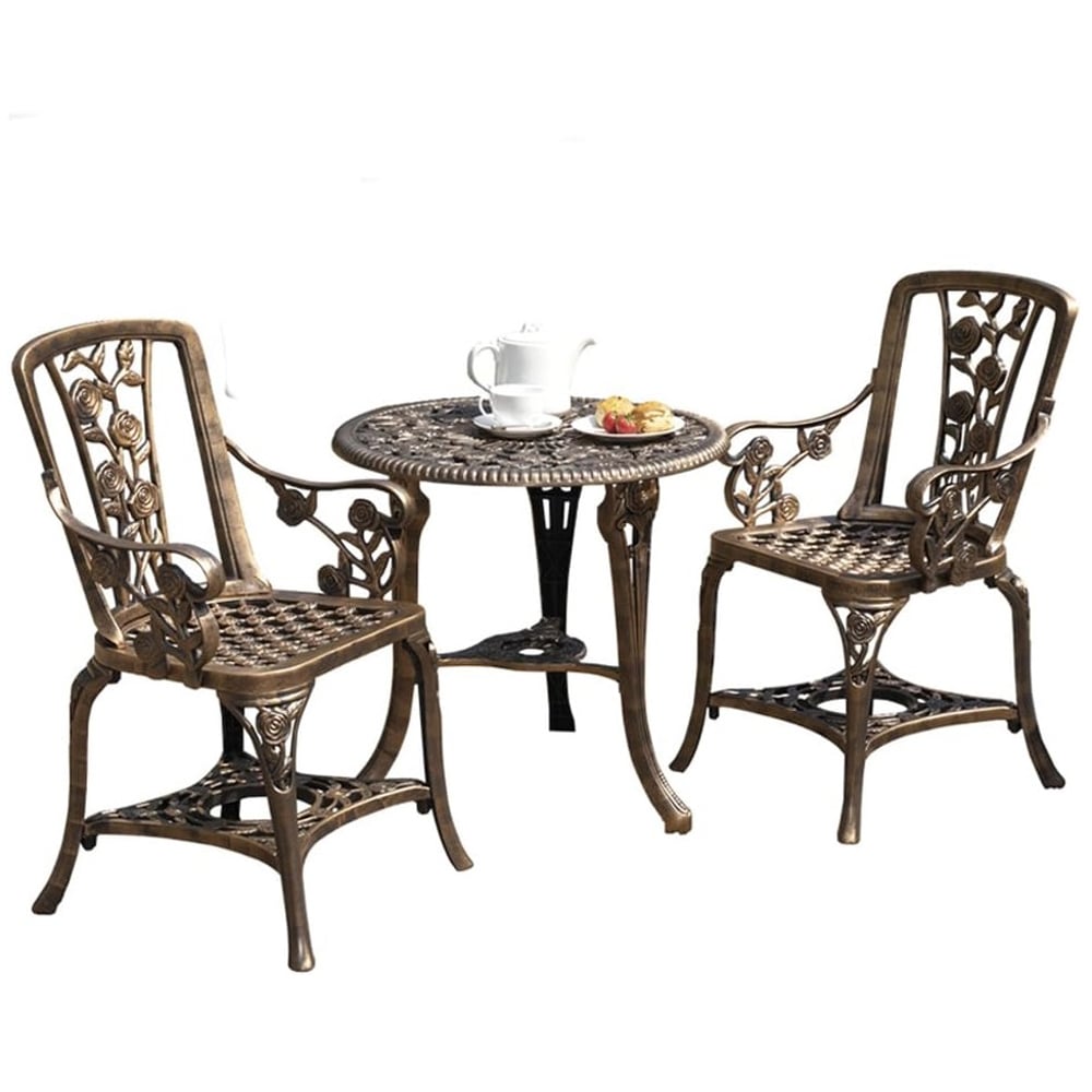 Sit back and relax with this stylish three-piece rose bistro set, consisting of two comfortable chairs, perfect for relaxing in the garden, and a matching table, the ideal place to put your newspaper, food or drinks. Designed to recreate a classic wrought iron look, this beautiful bistro set is actually made from UV-stabilised PVC, making it strong, rust-proof, lightweight and easy to move around your garden. There is a useful 4cm round hole in the middle of the table, suitable for parasols and umbrellas. This bistro set is perfect for gardens, decking, conservatories, patios, courtyards and balconies. Specification: Table measures: H66 x 67cm diameter. The table has a 4cm hole for an umbrella or parasol. Each chair measures: H87 x W45 x L45cm. Home assembly is required. Maximum chair user weight: 100kg.