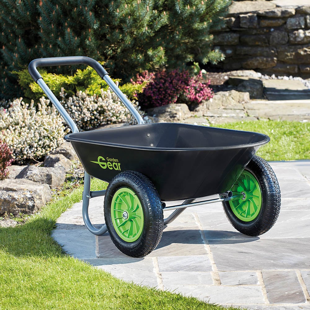 Whether you need to move compost, logs, soil, paving slabs, building materials or potted plants, this amazing heavy-duty two-wheeled plastic wheelbarrow by Garden Gear makes any job a breeze. Incredibly strong and durable, the chassis of the wheelbarrow is constructed from hardwearing powder-coated steel and is paired with a highly durable polypropylene tub. The innovative two-wheeled design of this trolley-style wheelbarrow cart improves stability and makes it much easier to manoeuvre meaning you’re less likely to twist and topple sideways. Because of the two-wheeled design, you can spread the weight of your load better. This means you don't have to teeter when balancing a full wheelbarrow, and there is less strain when lifting heavy loads. Handling loads up to an amazing 120kg with a huge 78-litre capacity, the wheelbarrow even has a rubberised comfort grip handle to make all jobs a pleasure. It measures L125 X W70 X H66cm, weighs just 9.5 kilograms and can be assembled and ready to use in minutes. Specification Dimensions: L125 X W70 X H66cm Tray size: L90 X 65 X 27cm Maximum load: 120kg 78-litre capacity Net weight: 12kg Some self-assembly required.