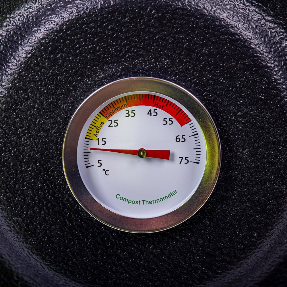 Garden Gear Bio-Heat Composter transforms garden and kitchen waste into rich organic compost in just 30-90 days! With a generous 110L capacity, its thermal insulation structure conserves heat, leading to a rapid breakdown of waste material so it works efficiently all year round. A vertical ventilation system provides the optimum conditions for micro-organisms to break down waste material evenly and efficiently while an automatically activated carbon filtration system helps eliminate unpleasant odours and avoids attracting pests and vermin. Monitor the internal temperature of your composter with the easy-to-read external thermometer - the higher the temperature the faster the waste material is breaking down. The best mix of materials is a balance of wet and dry waste - dry products such as twigs and leaves will aid aeration and speed up the composting process. A built-in reservoir chamber at the base of the composter collects liquid from the composting process, providing an organic, nutrient-rich fertiliser that is liquid gold for your garden and plants. Crafted from durable HDPE/EPP in sleek black, this advanced composter is the perfect eco-friendly solution for any garden. Garden Gear Bio-Heat Composter comes with the Compost Turning and Mixing Crank, an easy-to-use tool to help turn and aerate your compost. Simply place the corkscrew end deep into the compost pile and turn the crank, drawing the core material to the surface. Repeat this several times to ensure your compost is well aerated, accelerating decomposition by providing the optimal conditions for aerobic composting bacteria. The crank is supplied in two parts, simply attach them together and it’s ready to use. Includes: 1 x Thermal Hot Composter, 1 x External Thermometer, 1 x Hose & Tap for collecting the liquid run-off, 1 x Carbon Filtration System, 1 x Hand Spade and 1 x Turning and Mixing Crank. Capacity: 110L. Dimensions: 84 x 55 x 55cms. Material HDPE/EPP.