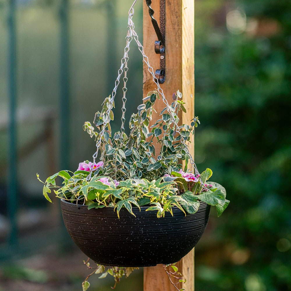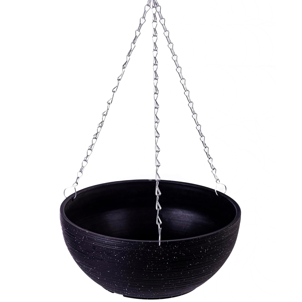 Elevate your garden's charm with the Stone Effect 35cm Hanging Basket in Black with Spot design, a masterpiece that flawlessly replicates the elegance of real stone. This eco-friendly basket is crafted from a blend of 70% recycled polypropylene and 30% stone powder, ensuring both durability and environmental responsibility. It's designed to withstand the harshness of UV rays and frost, promising to maintain its vibrant colour and structural integrity season after season. The included 50cm chain with a three-way connection allows for easy adjustments and secure hanging, making it a practical yet stylish choice for displaying your favourite plants.