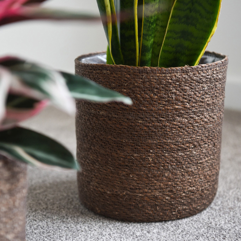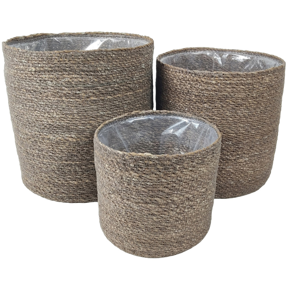 These Chia Seagrass Planter Baskets combine natural materials, contemporary style and practicality. Handwoven from natural seagrass fibre, the planters are sturdy but lightweight and have a simple, rustic design that is perfectly on-trend. The planters come with an interior plastic coating so you can use them to hide plastic pots and trays and create a natural vibe that shows off your plants beautifully. As this is a handcrafted product made from natural materials, slight size variance may occur. Chia Seagrass Planter Basket comprises 3 planters in the following 3 different sizes: Large - D: 25, H: 25 cm. Medium - D: 22, H: 22 cm. Small - D: 17, H: 16 cm.